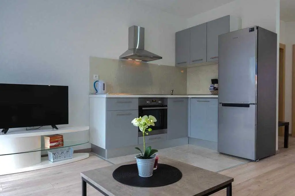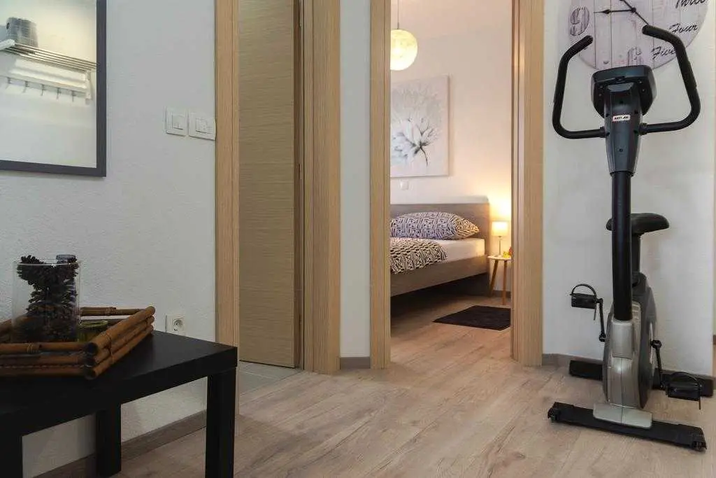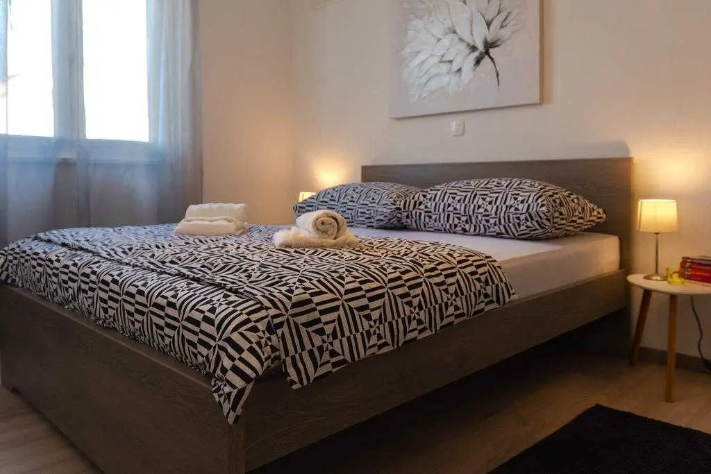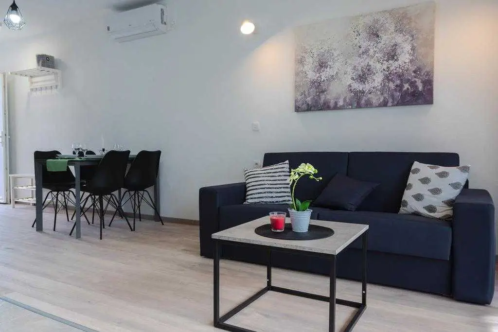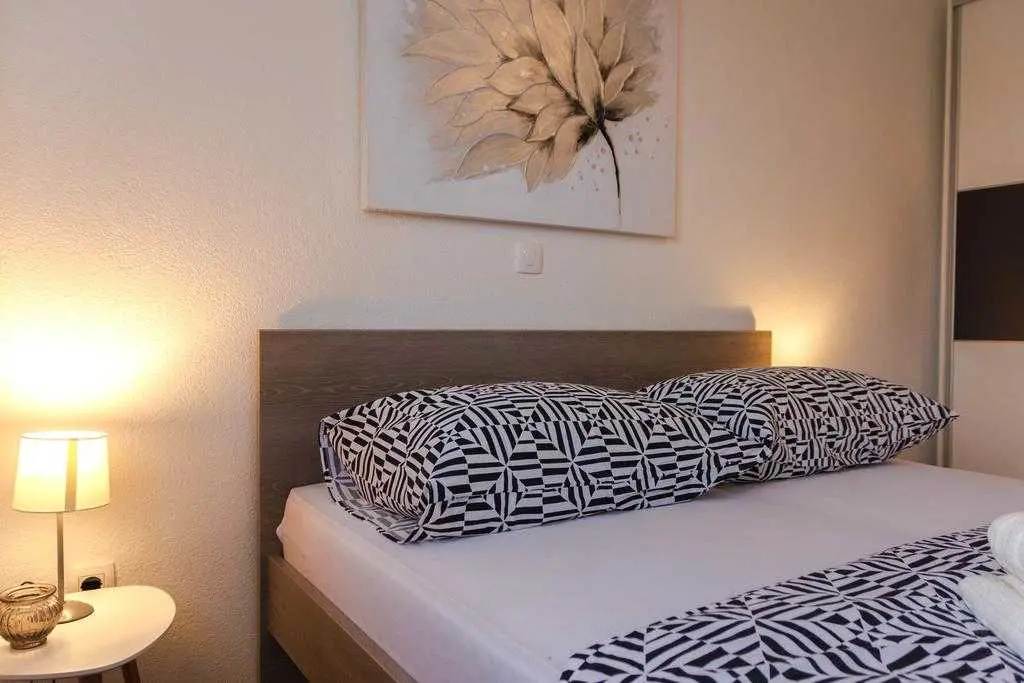 Sodobno udoben apartma z balkonom v zasebni hiši le 100m od čudovite plaže. Ima brezplačno parkirišče na dvorišču hiše, skupni kamin, brezplačen brezžični internet in je klimatiziran. Nahaja se v prvem nadstropju nove moderne hiše.