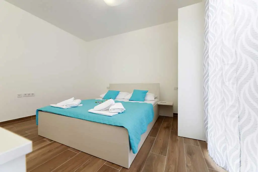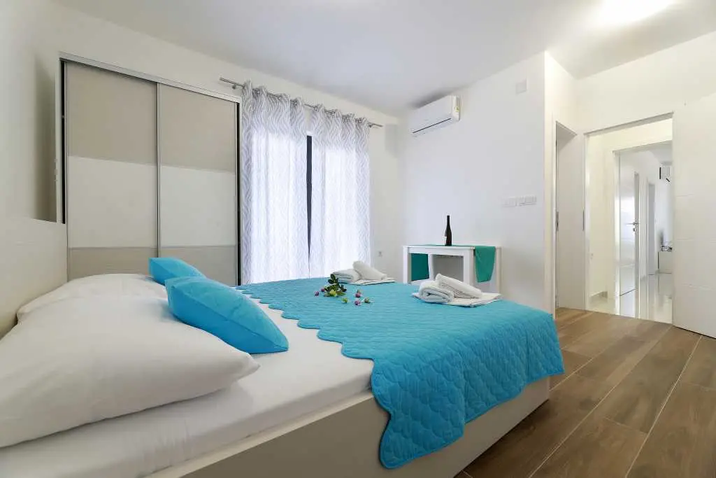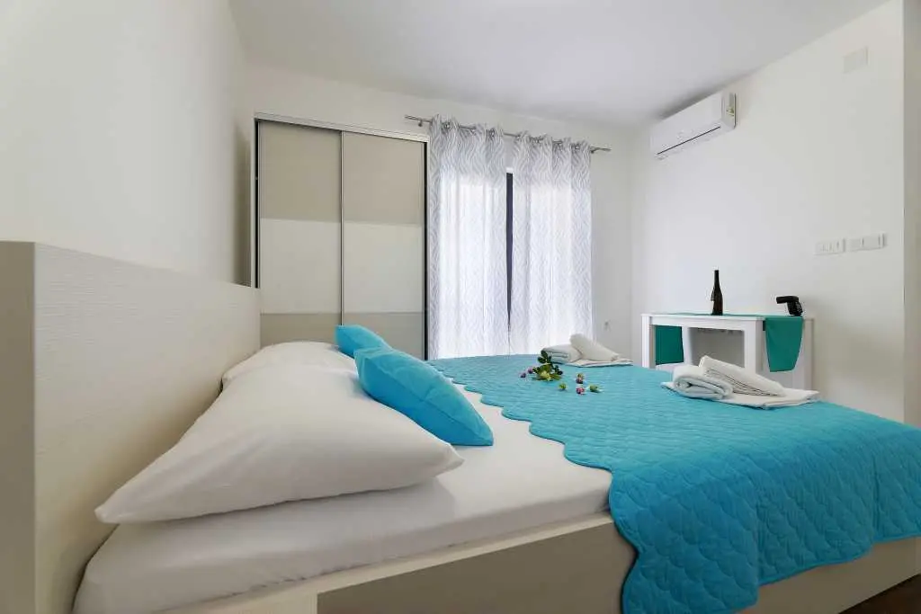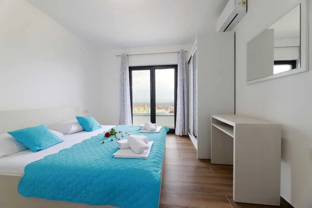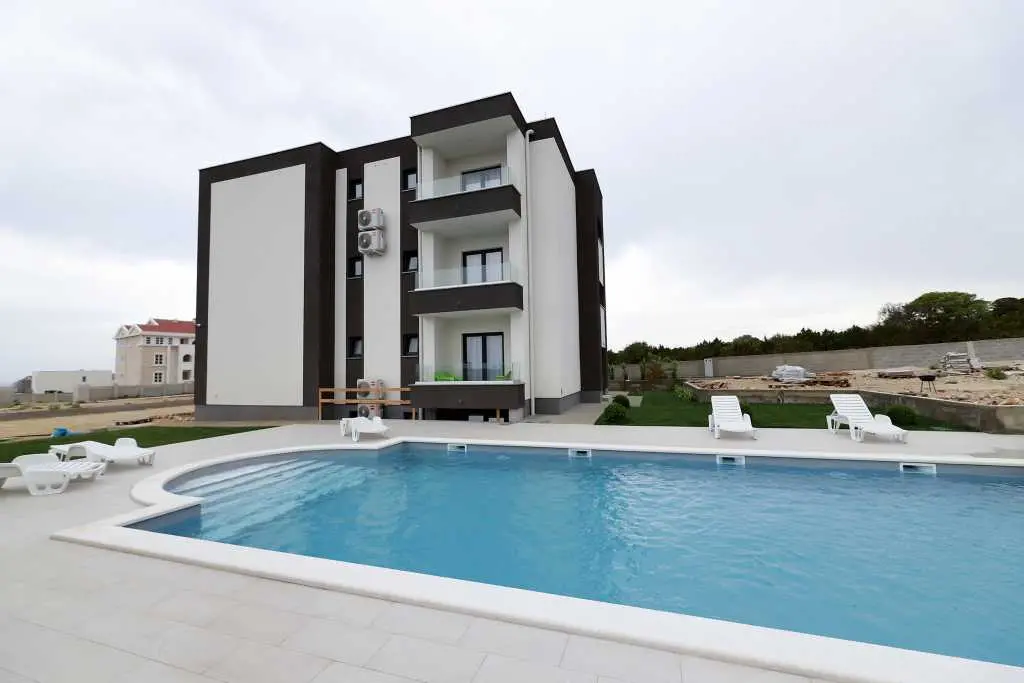 Vila je sestavljena iz 12 popolnoma novih in modernih apartmajev, 6 enosobnih apartmajev za 4-5 oseb in 6 garsonjer za 2-3 osebe. Vsaka nastanitvena enota ima klimatsko napravo, brezžični internet, popolnoma opremljeno kuhinjo ter mokre kopalnice in balkone. Studio apartma obsega en prostor z zakonsko posteljo in dodatnimi ležišči, kuhinjo, TWC, TV / SAT, wi-fi, klimatsko napravo, balkon z mizo in stoli, parkirišče. Apartma vključuje eno spalnico z zakonsko posteljo in dodatnim ležiščem, kavč v dnevna soba za dve osebi, kuhinja in jedilnica, TWC, TV / SAT, wi-fi, klima, balkon s stoli in stoli, sef, parkirišče. Ponudba: posteljnina in brisače, terasa, klima, brezplačen brezžični internet, brezplačno parkirišče. Apartma je v bližini centra Novalje in glavnega avtobusa do plaže Zrče (približno 200 m). Supermarket je oddaljen le 7-9 minut hoje. Plaža in morje sta oddaljena 10-15 minut hoje. Območje je podnevi in ponoči popolnoma varno in mirno.