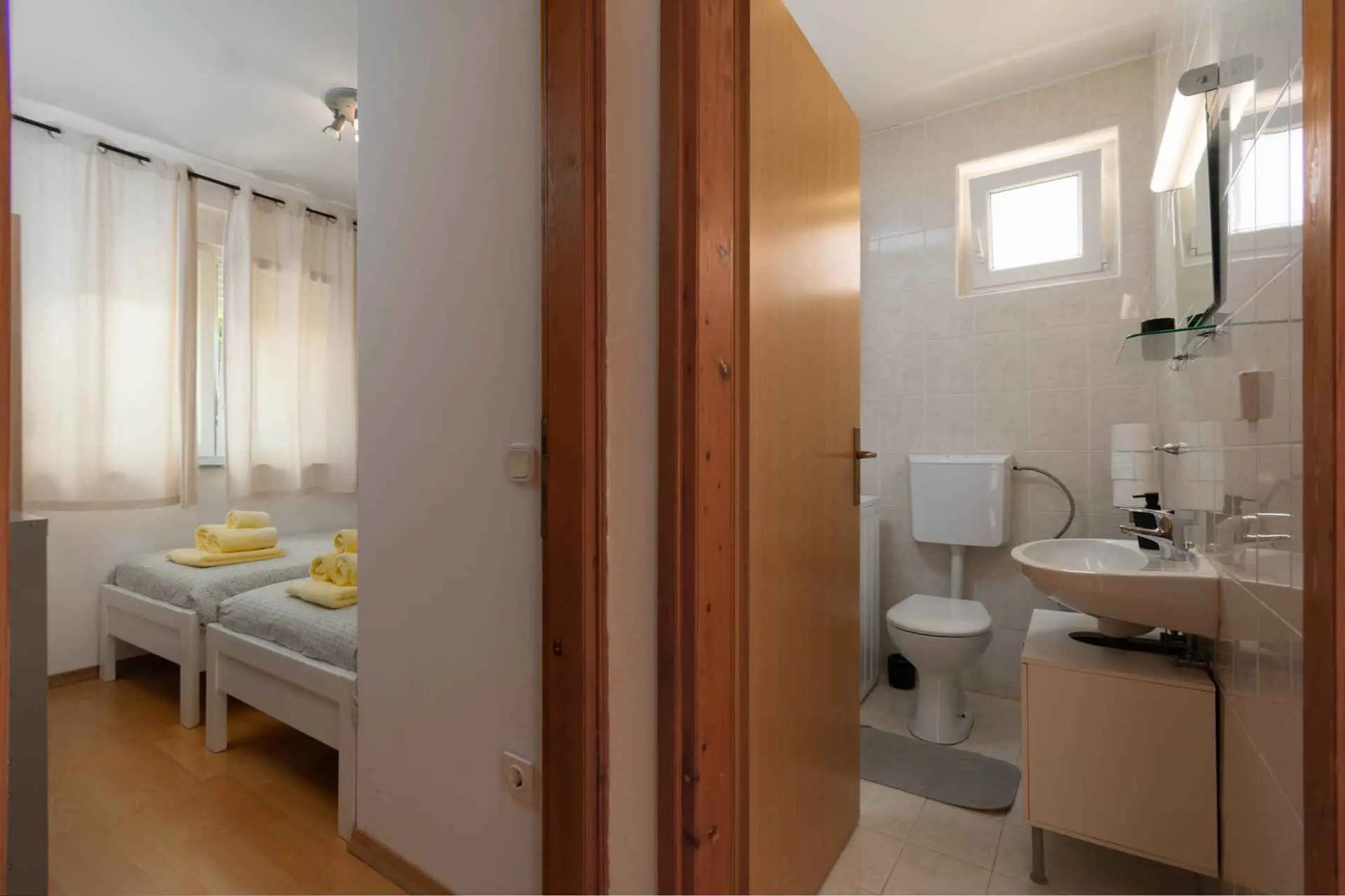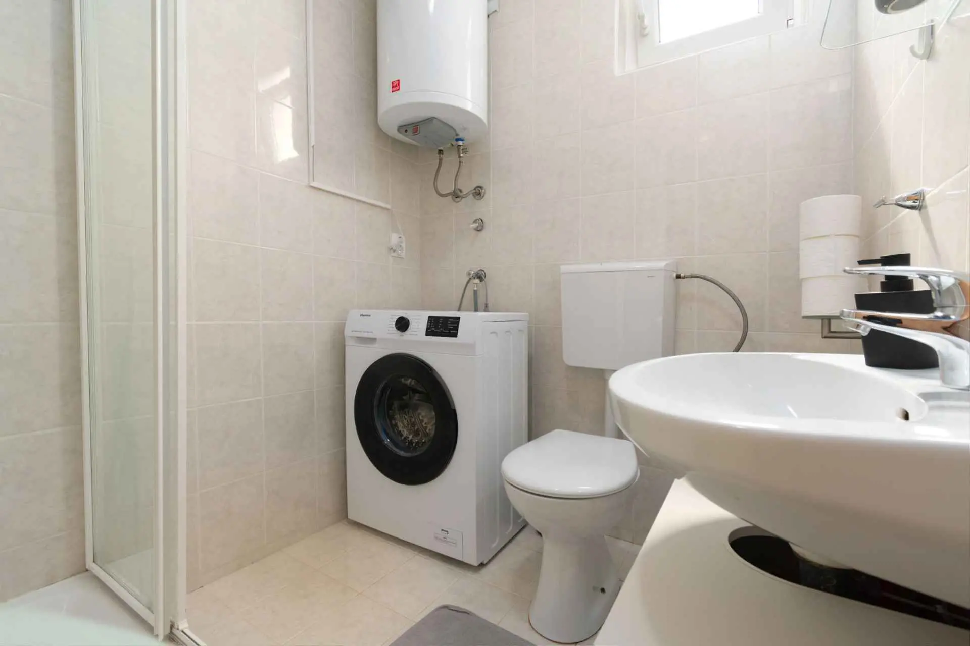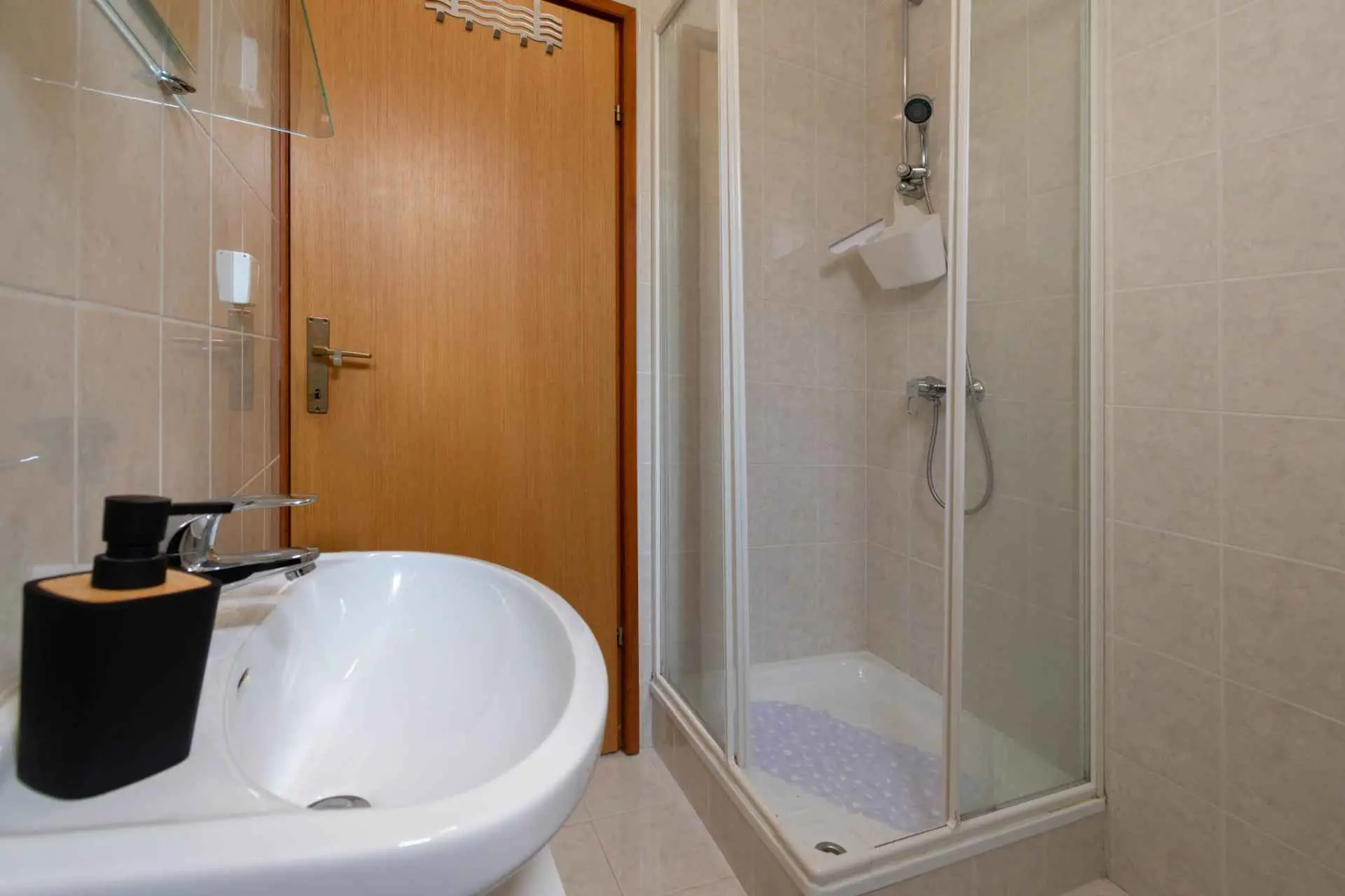 Dvosobno stanovanje le 1 km od morja z udobnimi 55 kvadratnimi metri, kot nalašč za namestitev majhne skupine 4 oseb. Apartma ima popolnoma opremljeno kuhinjo z vsemi potrebščinami za odlično obedovanje, vključno s štedilnikom s 4 gorilniki, pečico, hladilnikom z zamrzovalnim delom, pomivalnim strojem, mikrovalovno pečico, aparatom za kavo, aparatom za sendviče in opekačem kruha. Glavni prostor je klimatiziran z veliko naravne svetlobe in možnostjo spuščanja žaluzij. Drsna okenska vrata vodijo na velik balkon z zložljivo tendo, ki je odlična za obedovanje ali druženje, še posebej zvečer, ko opazujete sončni zahod nad morjem. Apartma ima 2 spalnici, obe z oknom in zatemnitvenimi zavesami, ventilator in stojalo za prtljago. Glavna spalnica je večja in ima zakonsko posteljo (160 cm) z ergonomsko vzmetnico iz trde pene, medtem ko ima manjša spalnica 2 enojni postelji (90 cm) s podobno vrsto vzmetnice. Kar zadeva tehnologijo, imate hiter internet in satelitsko televizijo z brezplačnim Netflixom.