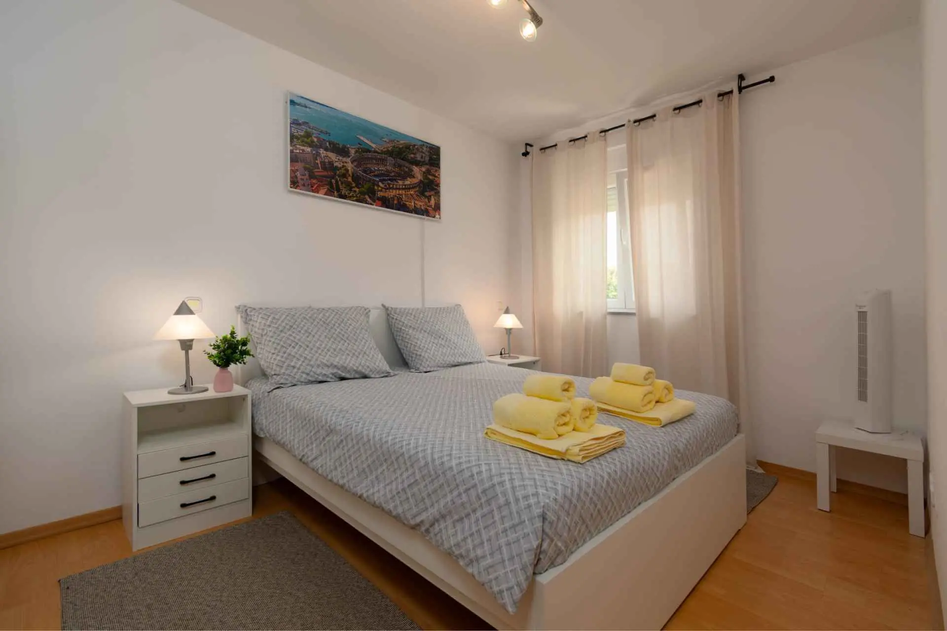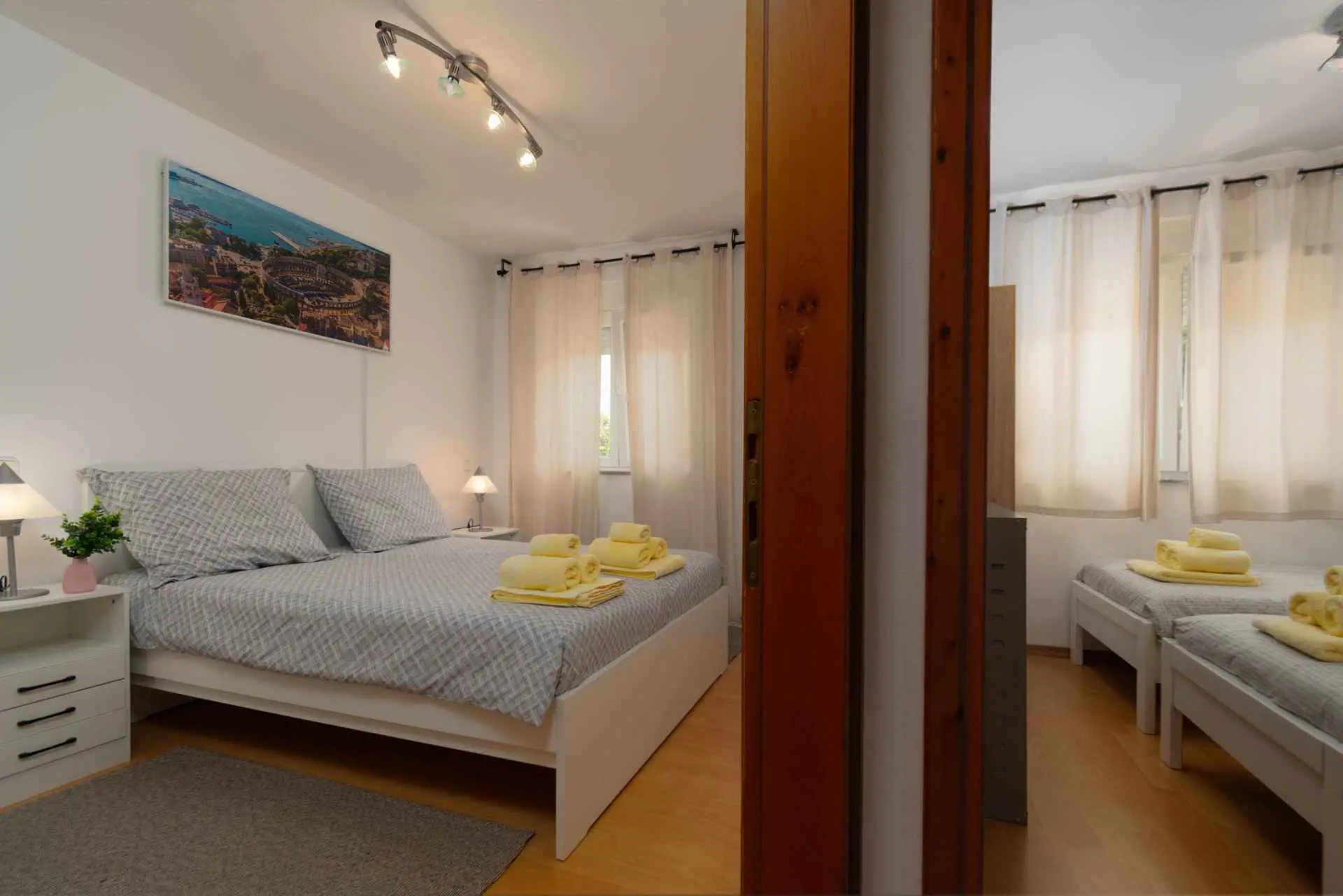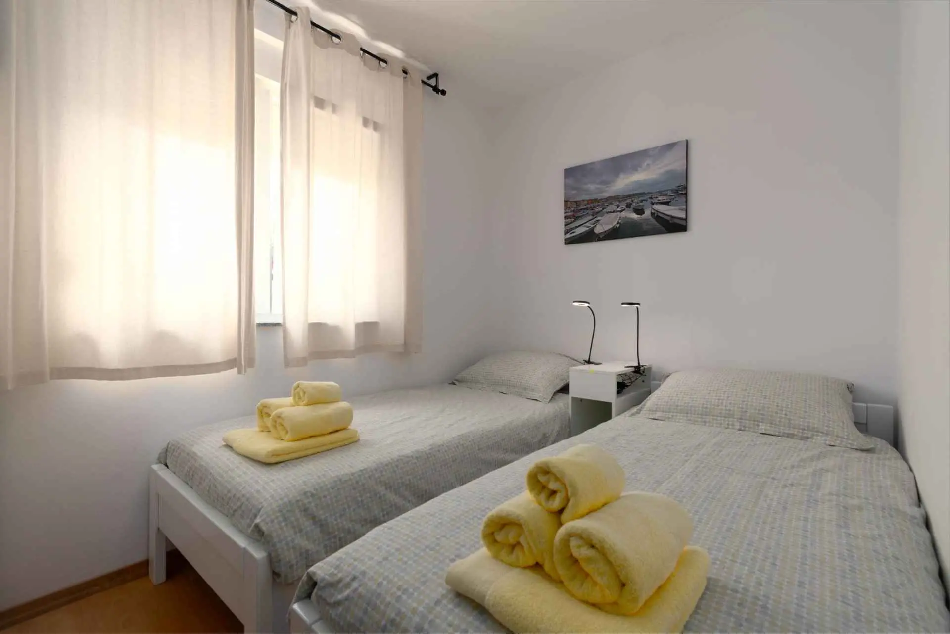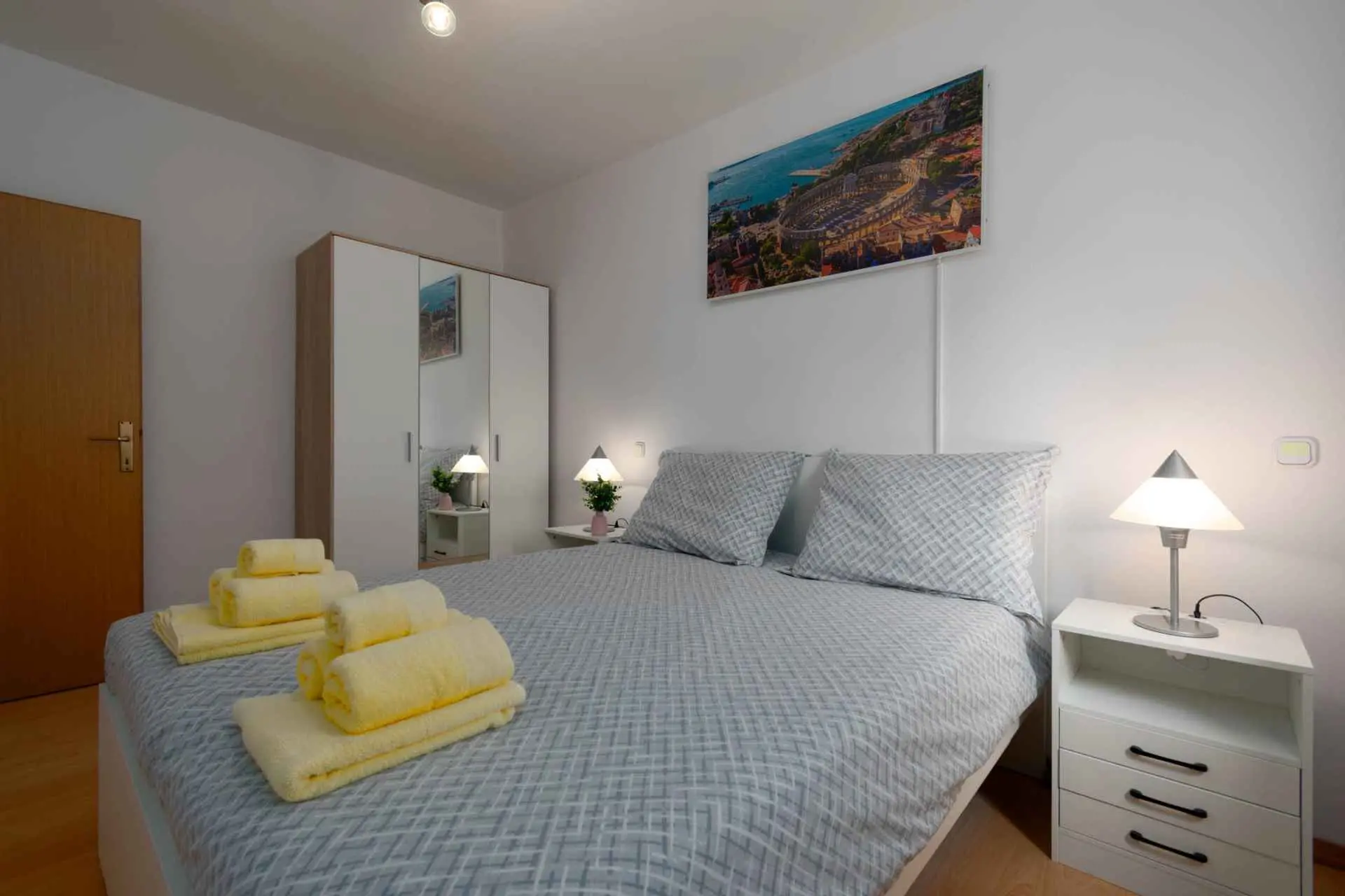 Dvosobno stanovanje le 1 km od morja z udobnimi 55 kvadratnimi metri, kot nalašč za namestitev majhne skupine 4 oseb. Apartma ima popolnoma opremljeno kuhinjo z vsemi potrebščinami za odlično obedovanje, vključno s štedilnikom s 4 gorilniki, pečico, hladilnikom z zamrzovalnim delom, pomivalnim strojem, mikrovalovno pečico, aparatom za kavo, aparatom za sendviče in opekačem kruha. Glavni prostor je klimatiziran z veliko naravne svetlobe in možnostjo spuščanja žaluzij. Drsna okenska vrata vodijo na velik balkon z zložljivo tendo, ki je odlična za obedovanje ali druženje, še posebej zvečer, ko opazujete sončni zahod nad morjem. Apartma ima 2 spalnici, obe z oknom in zatemnitvenimi zavesami, ventilator in stojalo za prtljago. Glavna spalnica je večja in ima zakonsko posteljo (160 cm) z ergonomsko vzmetnico iz trde pene, medtem ko ima manjša spalnica 2 enojni postelji (90 cm) s podobno vrsto vzmetnice. Kar zadeva tehnologijo, imate hiter internet in satelitsko televizijo z brezplačnim Netflixom.