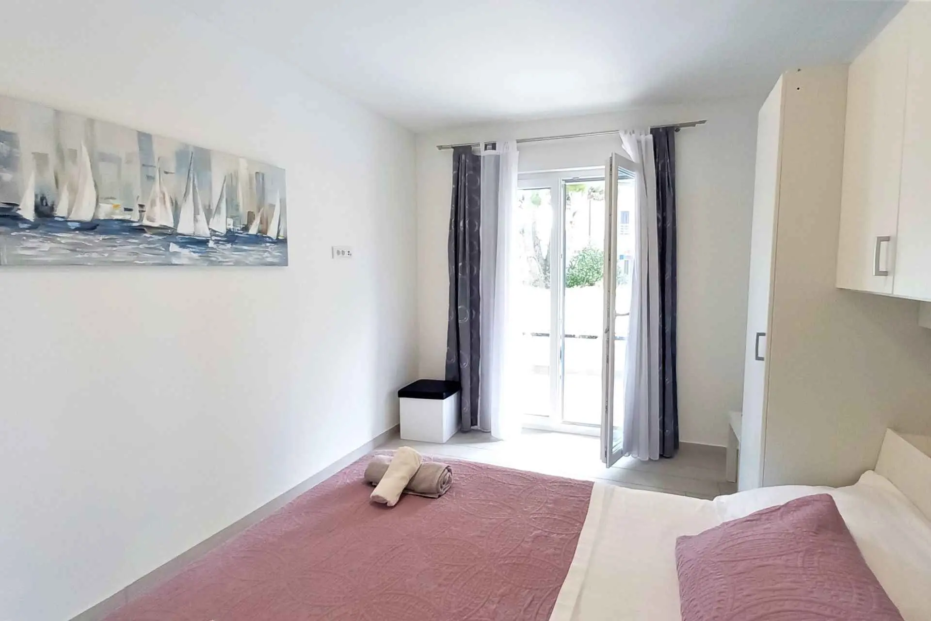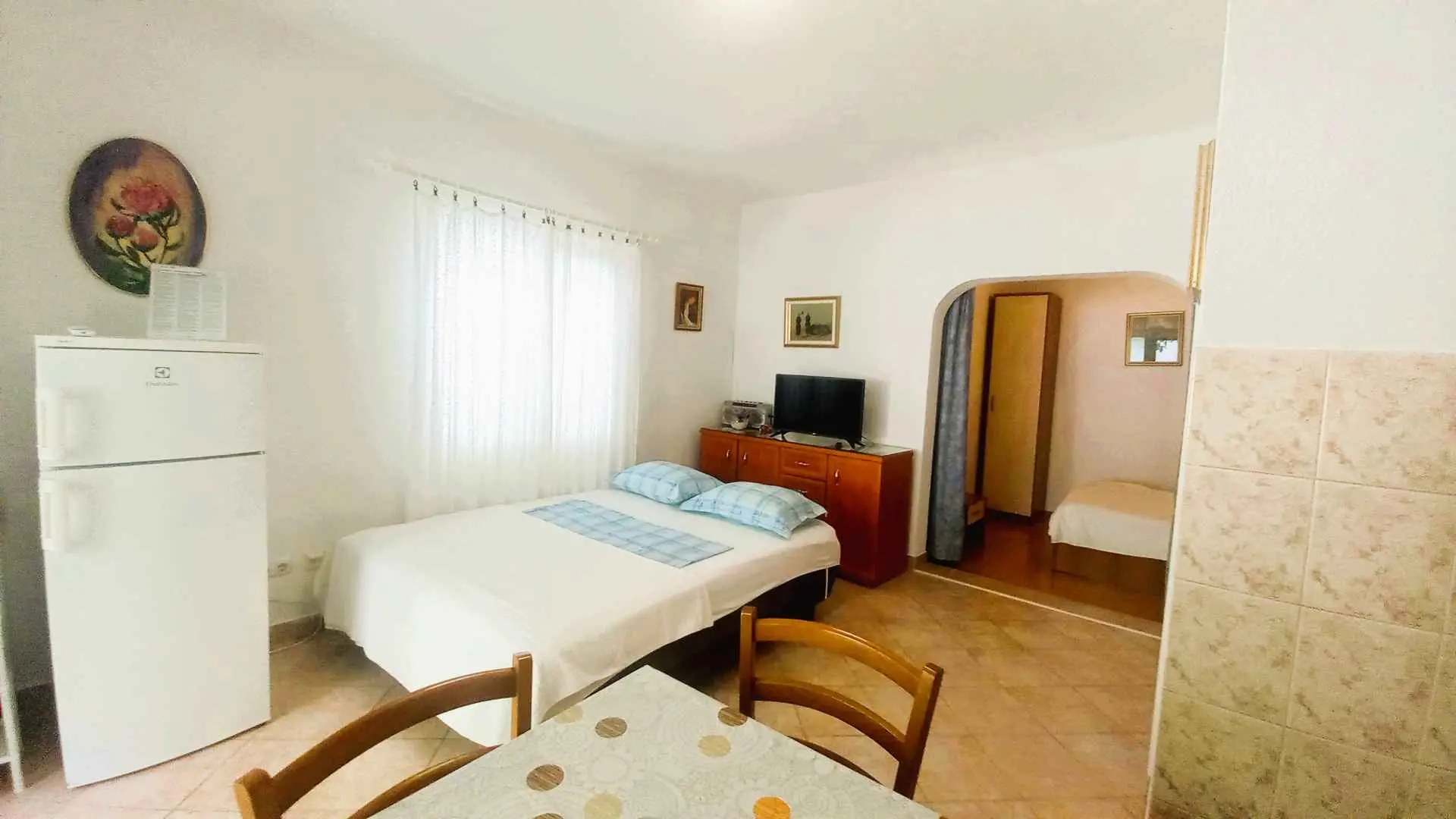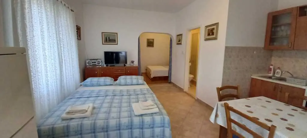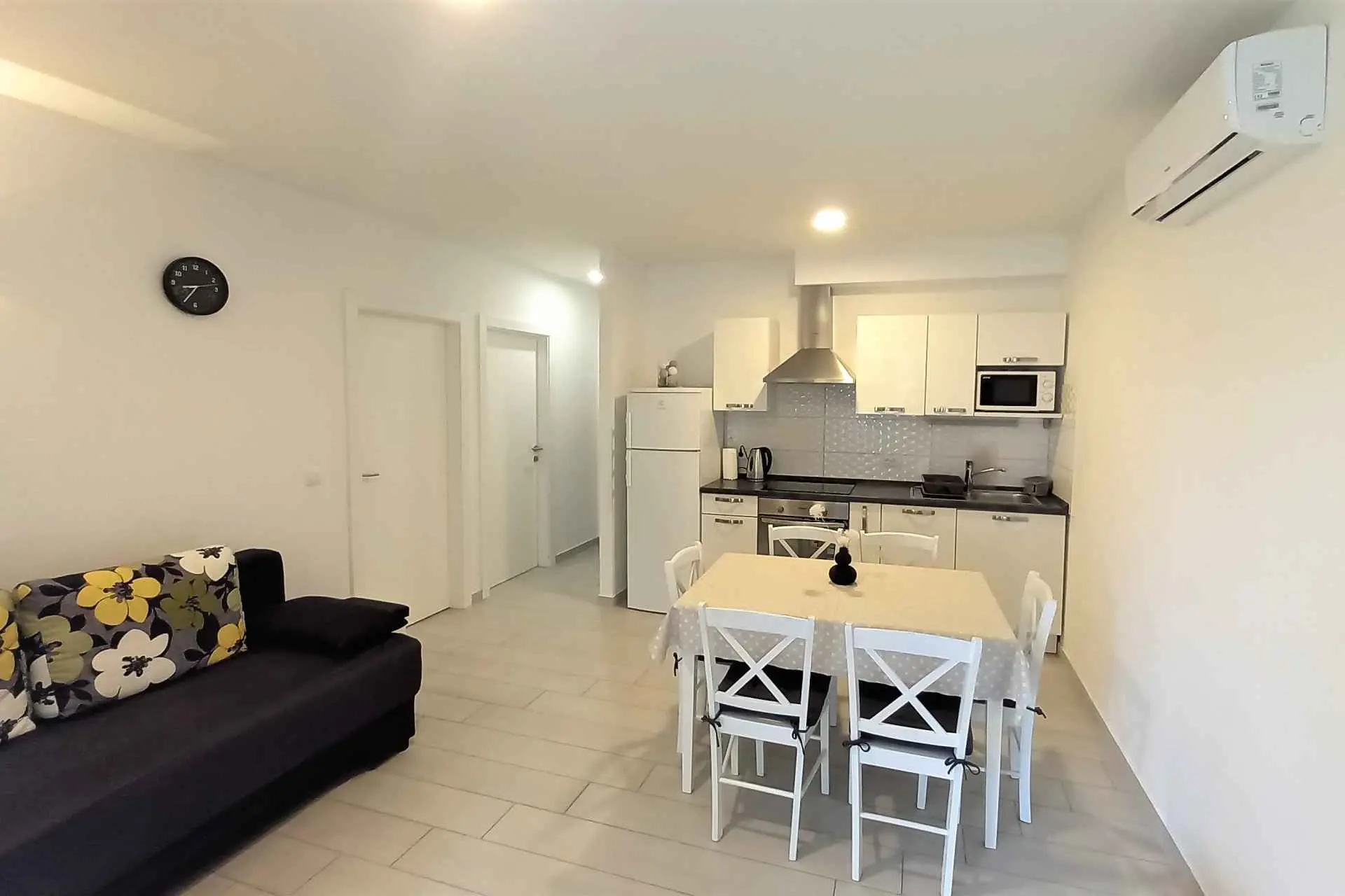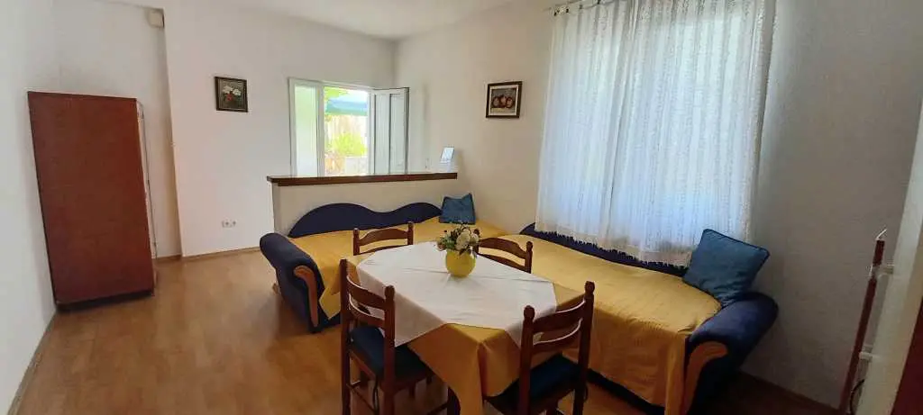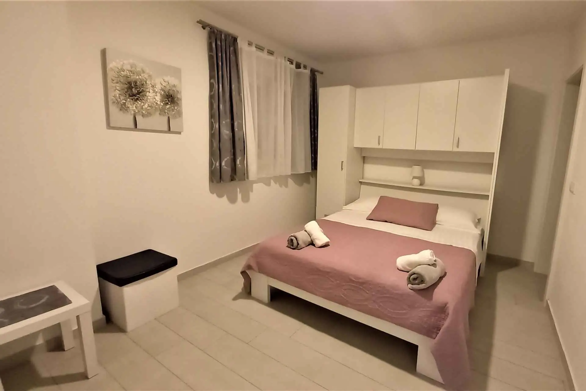 Apartmaja MIRA sestavljata 2 studio apartmaja za 4 osebe. Nahajata se v pritličju družinske hiše, približno 250 m od glavne plaže. Vsak apartma ima svoje parkirno mesto pred apartmajem. Poleg standardne opreme je v obeh apartmajih na voljo tudi pralni stroj. Apartma A4 je opremljen tudi s pomivalnim strojem. Vsak studio apartma ima 1 spalnico z zakonsko posteljo, ločeno z zaveso. V dnevni sobi sta 2 dodatni ležišči. Apartmaja se nahajata drug ob drugem, kar je idealno za dve družini, ki želita bivati skupaj.