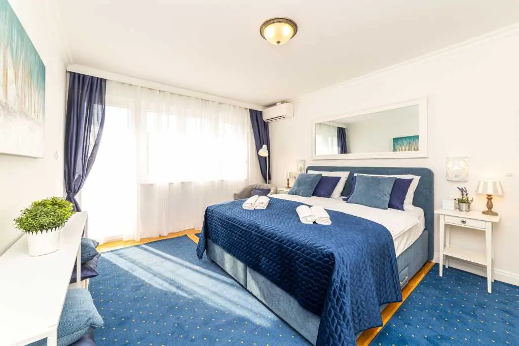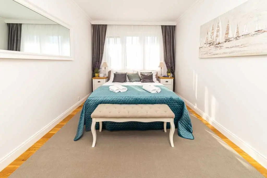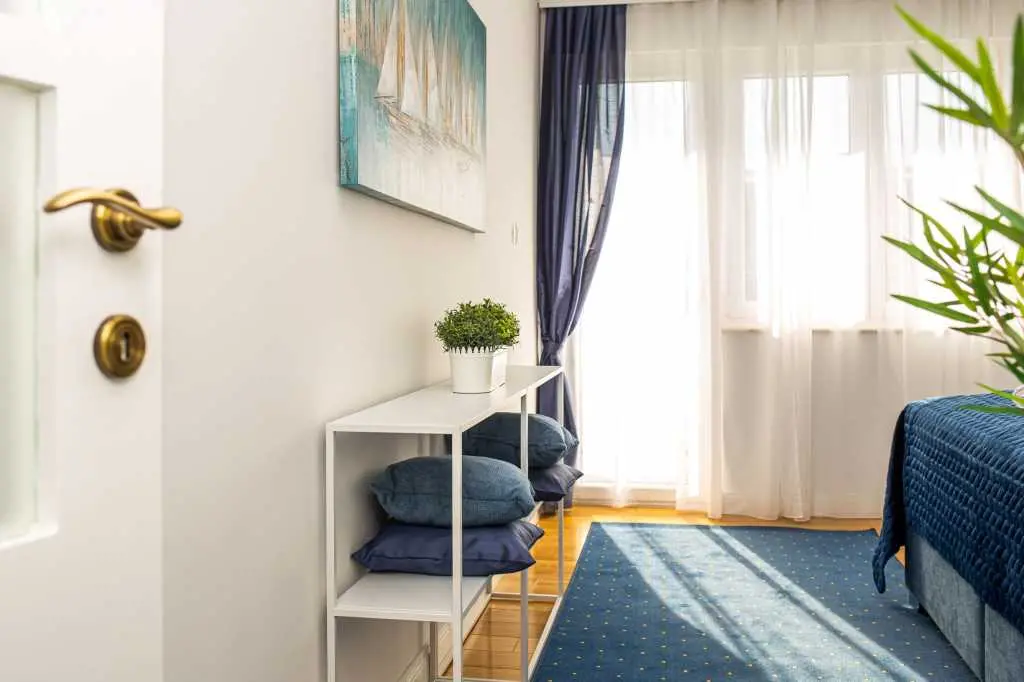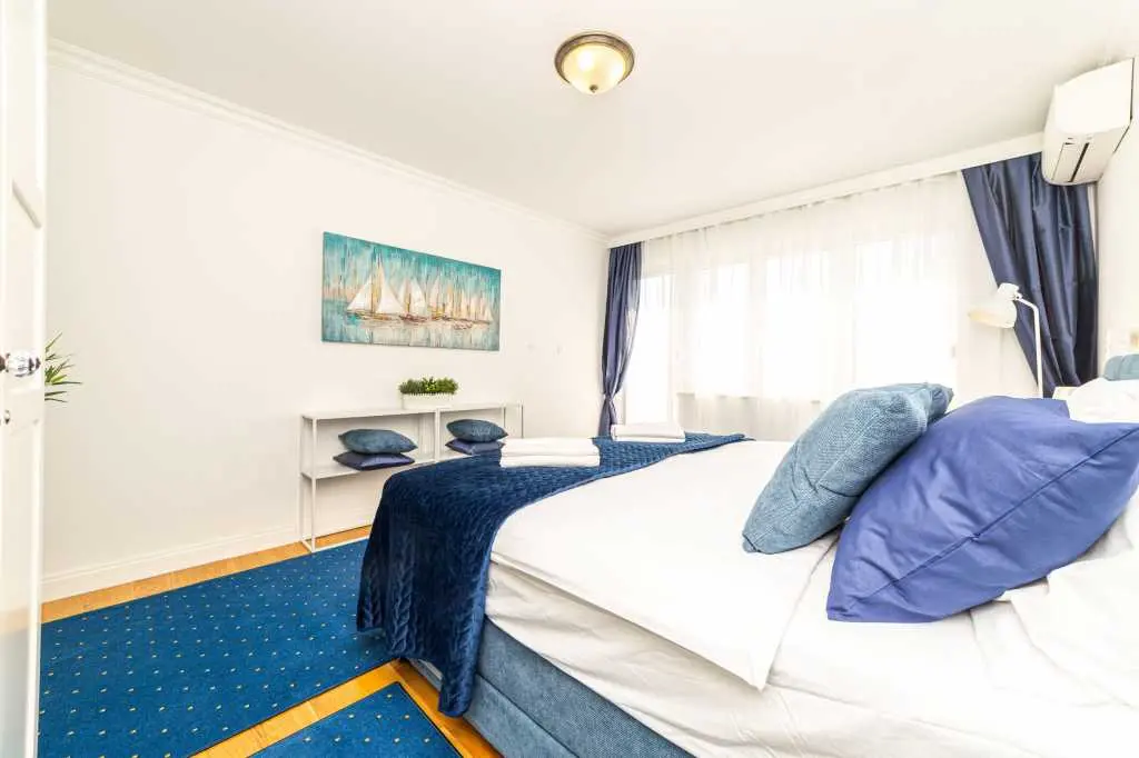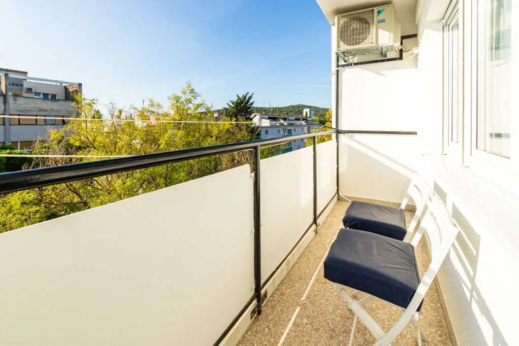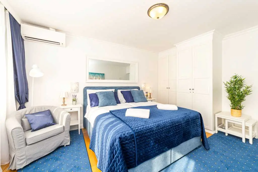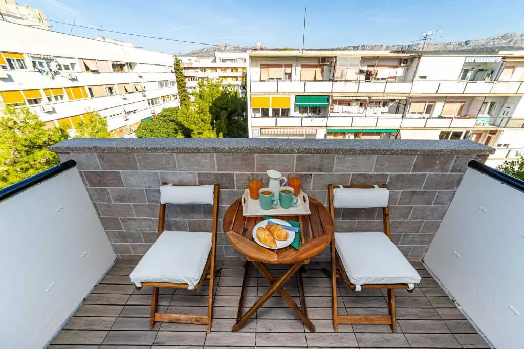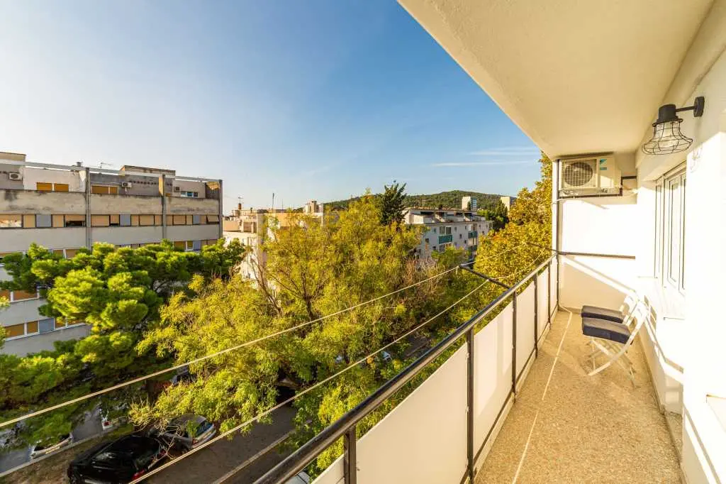 Novo prenovljeno, vrhunsko dvosobno stanovanje Z ZASEBNO GARAŽO, blizu centra Splita (približno 5 minut hoje) in Rive (riva, približno 10 minut hoje) kratek sprehod do hriba Marjan park... Lokacija stanovanja je samo nasproti starega arheološkega muzeja na Zrinsko-Frankopanski ulici, kar je super, saj je dovolj blizu centra mesta, ima priročne trgovine z živili, pekarne, kavarne, lekarno in celo kmečko tržnico v bližini, a je dovolj mirno, da lahko opravite svoje delo. Stanovanje ima zanesljivo super hitro optično internetno povezavo. Apartma ima dve dvoposteljni spalnici, obe z zakonskima vzmetnima posteljama (180 x 200 cm in 160 x 200 cm). Dodatno je ena izmed spalnic opremljena z delovno mizo in pisarniškim stolom. Na voljo je popolnoma opremljena kuhinja (hladilnik/zamrzovalnik, pomivalni stroj, pečica, napa, kuhinjska posoda, mikrovalovna pečica, steklokeramični štedilnik, opekač kruha, kuhalnik za vodo...in pralni stroj, ki je priročno skrit za kuhinjskimi elementi). Apartma ima kopalnico z udobno nadglavno prho in talnim gretjem, ima grelno stojalo za brisače in sušilec za lase. Imata dva balkona, manjši (severno obrnjen) je povezan s kuhinjo/bivalnim prostorom in je opremljen z balkonsko mizo in stoli ter velik sončen balkon, ki gleda na jug in je opremljen z balkonskimi stoli. Klimatske enote so v obeh spalnicah in v kuhinji/bivalnem prostoru in se uporabljajo tako za hlajenje poleti kot za ogrevanje v hladnejšem obdobju leta. Na voljo sta likalnik in likalna deska ter stojalo za sušenje perila. V prostoru hale je omara, kjer so shranjeni čistilni pripomočki in sesalnik (uporaba omare s čistilnimi pripomočki in sesalnikom se lahko dogovorimo glede na vaše potrebe). Stanovanje je opremljeno s protivlomnimi vhodnimi vrati z dvema ključavnicama. Zasebna garaža, ki se nahaja v isti stavbi, je na voljo za parkiranje, če ga potrebujete. Postaja lokalnega avtobusa (v primeru, da jo morda potrebujete) je približno 100 m od apartmaja. Avtobusna postaja (za avtobuse, ki povezujejo Split in Trogir) je približno 5 minut hoje stran. MINIMALNO BIVANJE v apartmaju: 5 noči