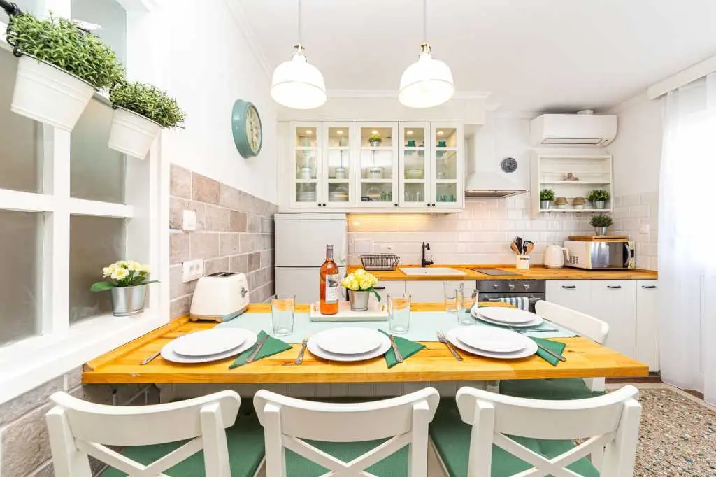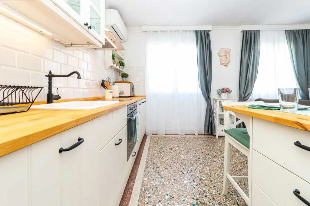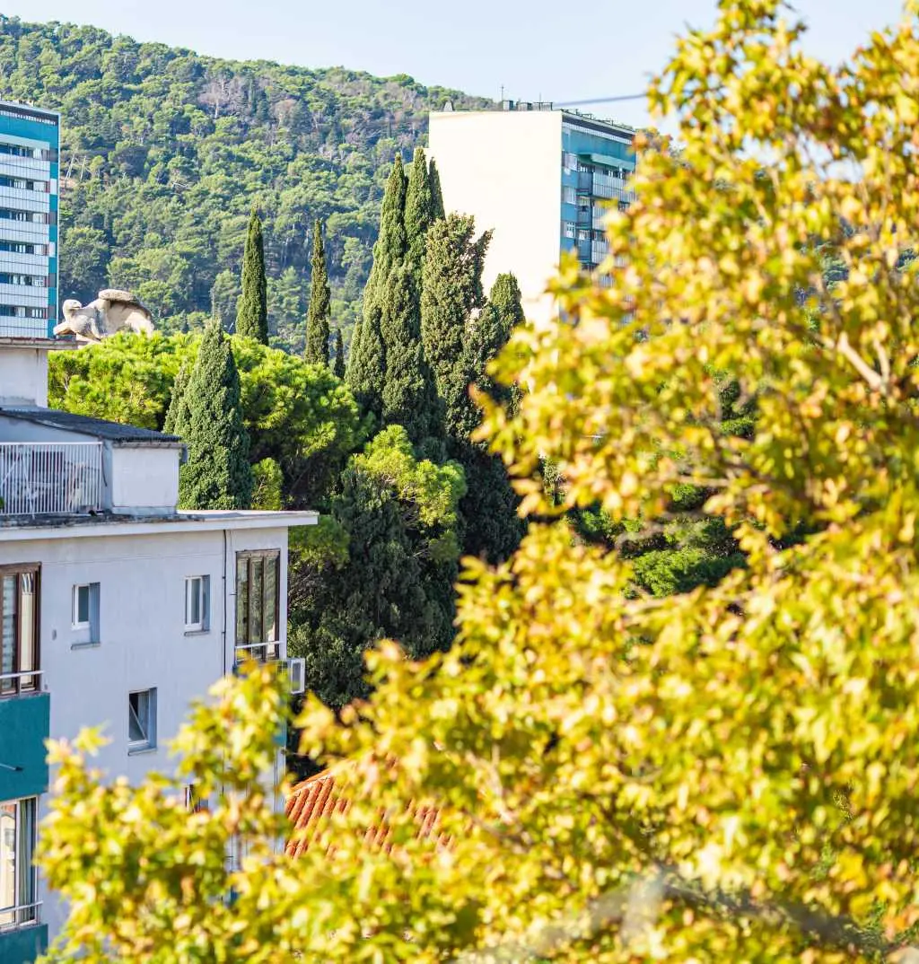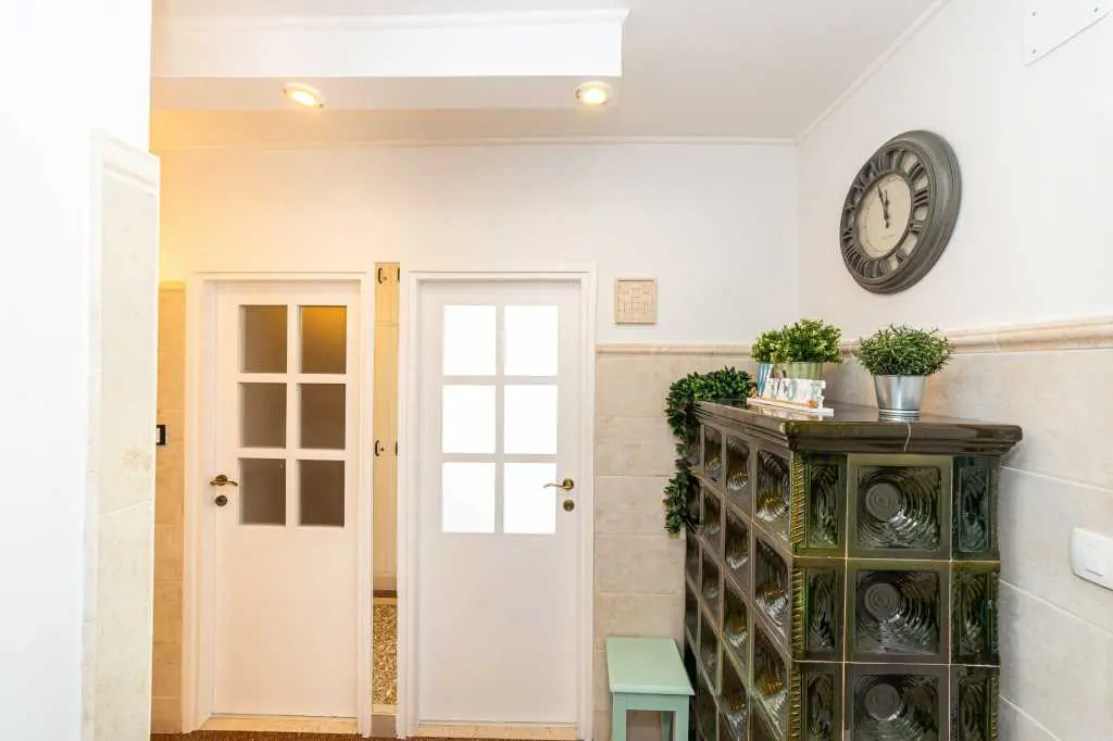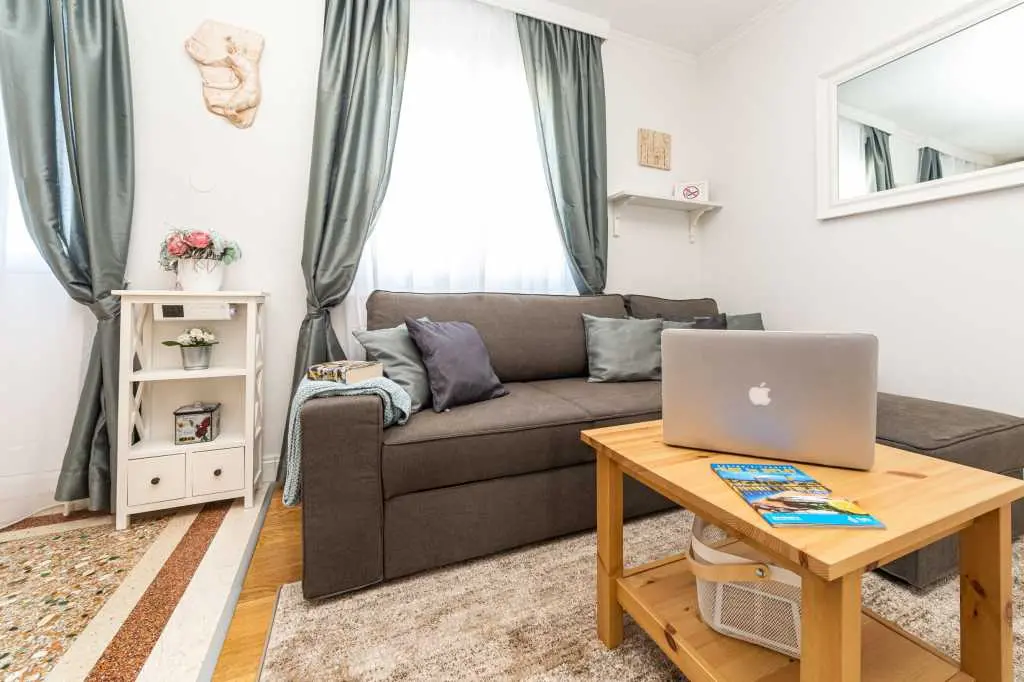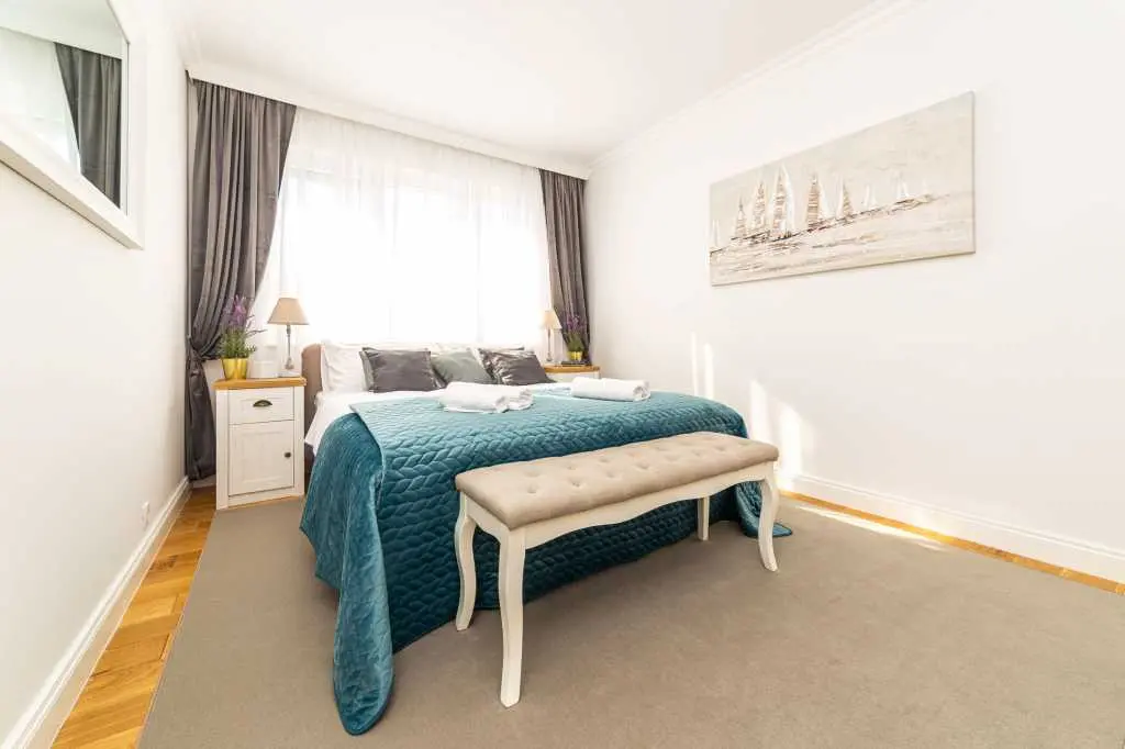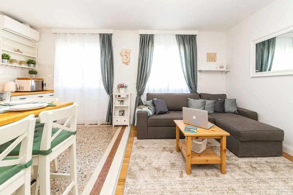 Novo prenovljeno, vrhunsko dvosobno stanovanje Z ZASEBNO GARAŽO, blizu centra Splita (približno 5 minut hoje) in Rive (riva, približno 10 minut hoje) kratek sprehod do hriba Marjan park... Lokacija stanovanja je samo nasproti starega arheološkega muzeja na Zrinsko-Frankopanski ulici, kar je super, saj je dovolj blizu centra mesta, ima priročne trgovine z živili, pekarne, kavarne, lekarno in celo kmečko tržnico v bližini, a je dovolj mirno, da lahko opravite svoje delo. Stanovanje ima zanesljivo super hitro optično internetno povezavo. Apartma ima dve dvoposteljni spalnici, obe z zakonskima vzmetnima posteljama (180 x 200 cm in 160 x 200 cm). Dodatno je ena izmed spalnic opremljena z delovno mizo in pisarniškim stolom. Na voljo je popolnoma opremljena kuhinja (hladilnik/zamrzovalnik, pomivalni stroj, pečica, napa, kuhinjska posoda, mikrovalovna pečica, steklokeramični štedilnik, opekač kruha, kuhalnik za vodo...in pralni stroj, ki je priročno skrit za kuhinjskimi elementi). Apartma ima kopalnico z udobno nadglavno prho in talnim gretjem, ima grelno stojalo za brisače in sušilec za lase. Imata dva balkona, manjši (severno obrnjen) je povezan s kuhinjo/bivalnim prostorom in je opremljen z balkonsko mizo in stoli ter velik sončen balkon, ki gleda na jug in je opremljen z balkonskimi stoli. Klimatske enote so v obeh spalnicah in v kuhinji/bivalnem prostoru in se uporabljajo tako za hlajenje poleti kot za ogrevanje v hladnejšem obdobju leta. Na voljo sta likalnik in likalna deska ter stojalo za sušenje perila. V prostoru hale je omara, kjer so shranjeni čistilni pripomočki in sesalnik (uporaba omare s čistilnimi pripomočki in sesalnikom se lahko dogovorimo glede na vaše potrebe). Stanovanje je opremljeno s protivlomnimi vhodnimi vrati z dvema ključavnicama. Zasebna garaža, ki se nahaja v isti stavbi, je na voljo za parkiranje, če ga potrebujete. Postaja lokalnega avtobusa (v primeru, da jo morda potrebujete) je približno 100 m od apartmaja. Avtobusna postaja (za avtobuse, ki povezujejo Split in Trogir) je približno 5 minut hoje stran. MINIMALNO BIVANJE v apartmaju: 5 noči