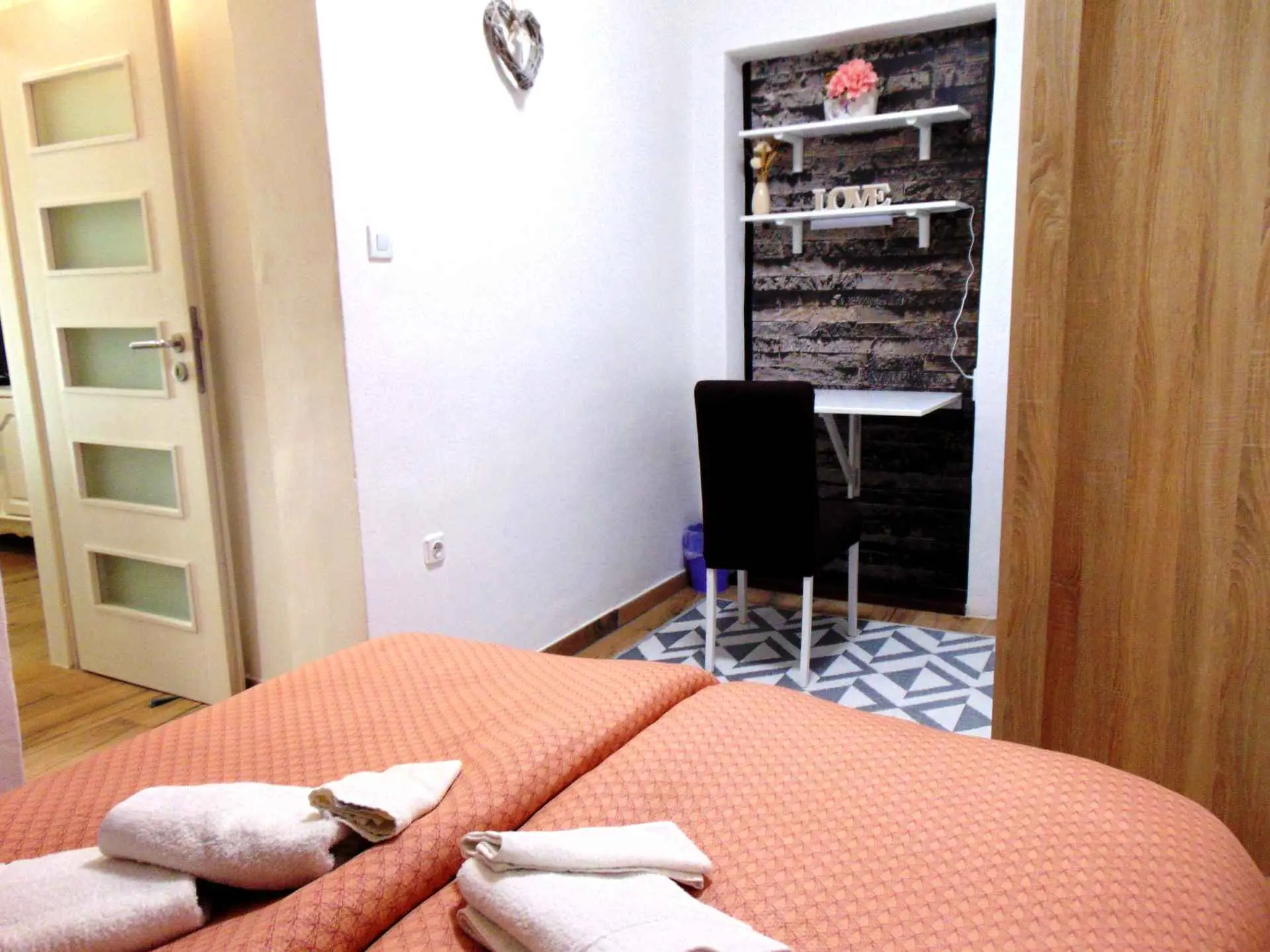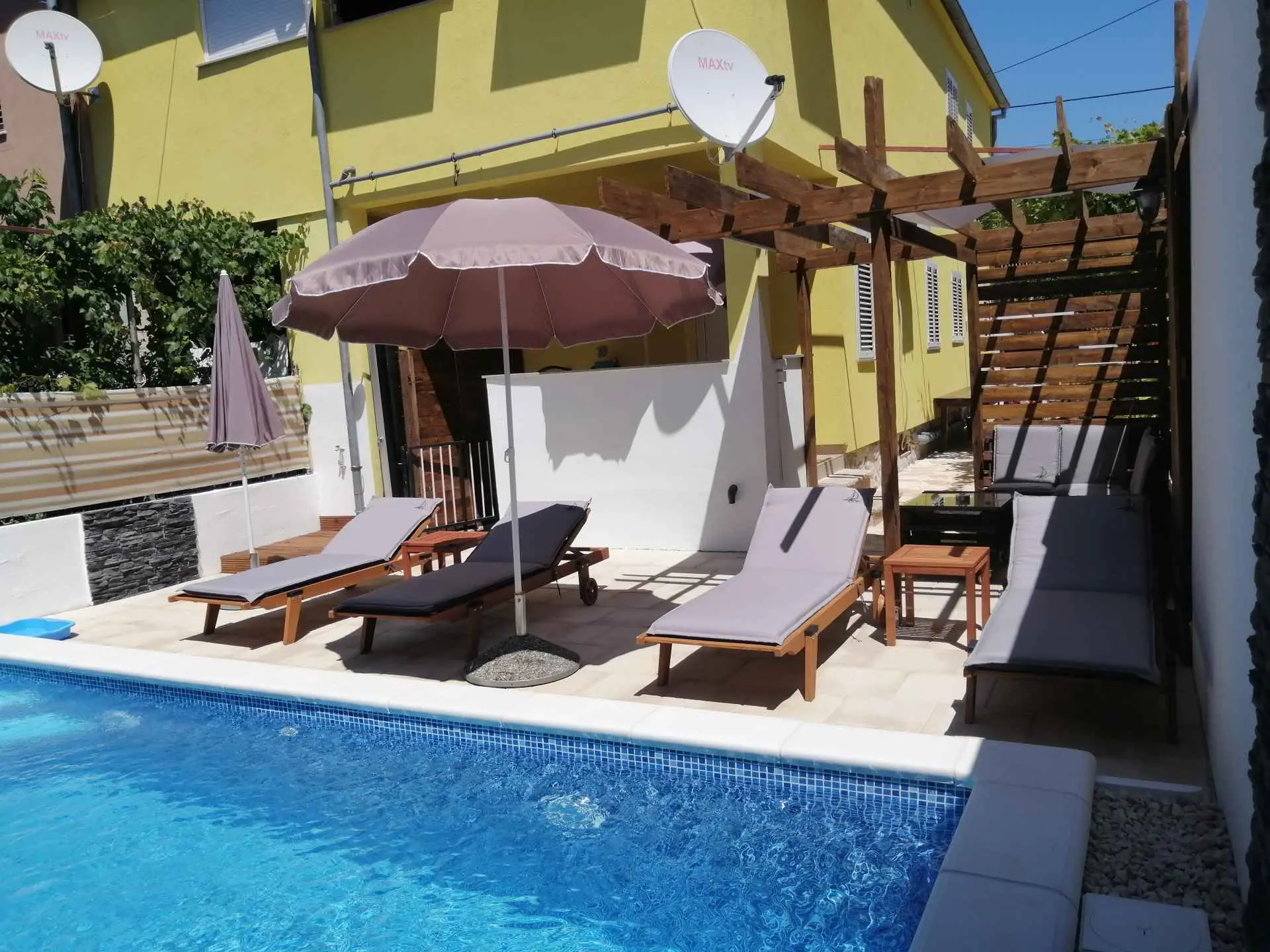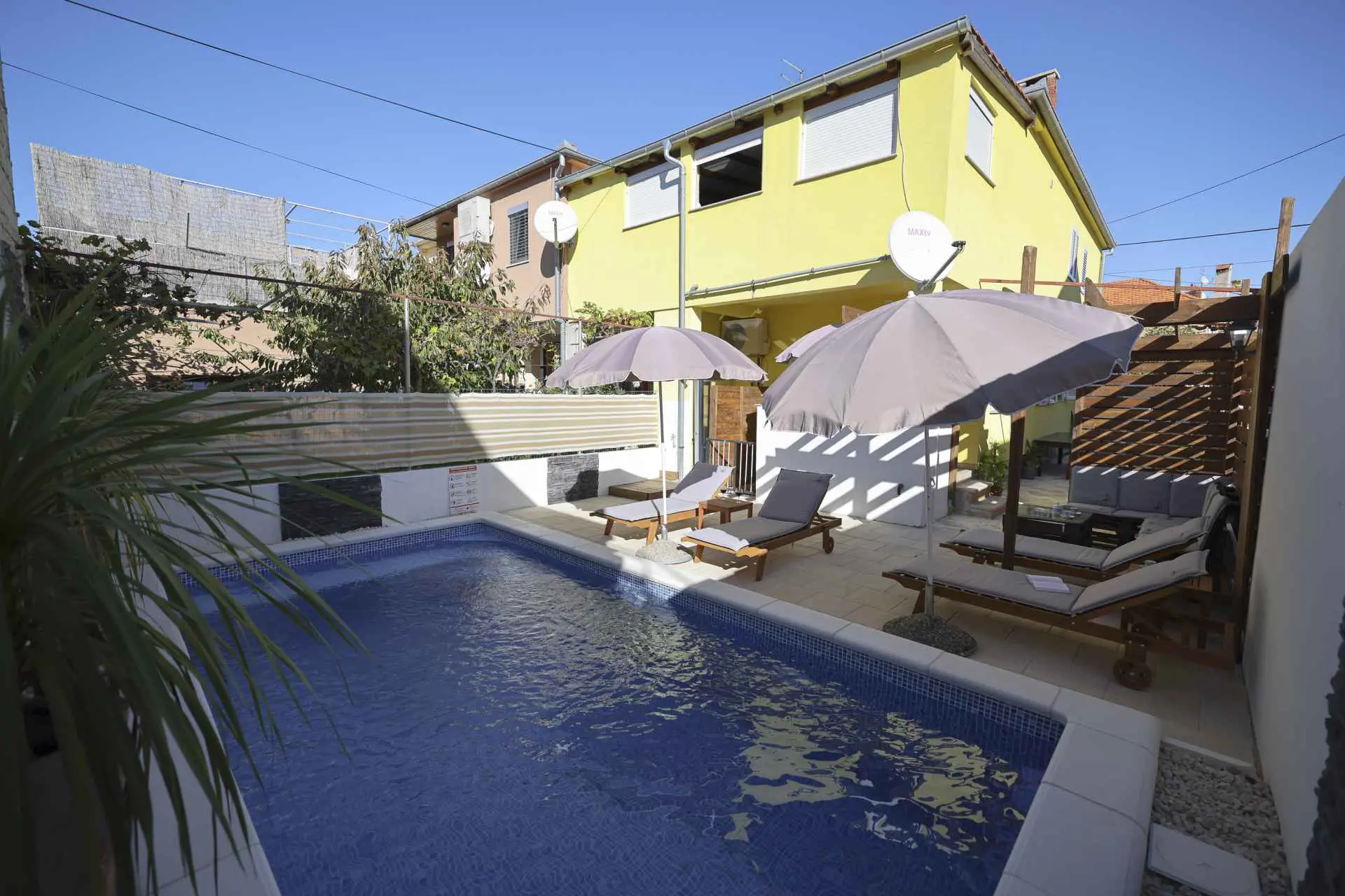 ZADAR, HRVAŠKA Dragi gostje! Hvala, ker ste za svoje počitnice izbrali Zadar in našo Rustiko Zadar! Upamo, da boste uživali v tem mestu in naredili naše počitnice nepozabne. Zagotovo se boste zabavali na Polni luni, Millennium Jumpu ali katerem izmed svetovnih glasbeno zabavnih koncertov. Morske orgle in Pozdrav soncu bodo dopolnili edinstveno doživetje na svetu!!! Uživajte v svoji poletni avanturi!! Dobrodošli v Apartma Rustica Zadar z ekskluzivno uporabo bazena, - v pritličju! Hiša dvojček v rumenem delu ponuja namestitev v 1 apartmaju v pritličju (ograjeno). Lastniki živijo v prvem nadstropju hiše, popolnoma ločeno od tega stanovanja. Apartma je sestavljen iz: -Kuhinja z jedilnico: popolnoma opremljena: posoda, štedilnik, hladilnik z zamrzovalnikom, pomivalni stroj, pralni stroj, mikrovalovna pečica, aparat za kavo, klimatska naprava, jedilna miza s 6 stoli -Dnevna soba: kabelska TV, komoda predalniki, raztegljiv kavč za 2 osebi, klubska mizica -2 kopalnici - kopalnica z wc-jem, tuš kabina, sušilnik za lase, - 2 spalnici (vsaka soba ima klimo, posteljo, omaro in mizo s sedežno garnituro + posteljnina in 2 brisači na osebo -5G Wi-Fi zunaj: -Balkon s pogledom na bazen in dvorišče - Ločen vhod v apartma - 1 varovano parkirno mesto pred hišo - Žar na dvorišču in sedežna garnitura -Zasebno bazen - sezonski bazen odprt: 01.05-30.09) (6x3x1.55) - Zunanji solarni tuš, -4 ležalniki - Sončenje ob bazenu -Pergola s sedežno garnituro 50 metrov od naše hiše je trgovina, picerija, dve pekarni, 2 frizerji, pedikura in kozmetični salon. 300 m od našega Apartmaja Rustika se nahajajo veliki supermarketi (Kaufland, Interspar, Tommy, Plodine, Konzum), restavracije in lekarna. Igralnica za pse: 800m Plaža za hišne ljubljenčke: 2 km 2 km od plaže in starega mesta (center Zadra) V neposredni bližini apartmaja Rustica se nahaja zunanji športni center "Višnjik", kompleks odprtih igrišč in spremljajočih objektov pod osvetlitvijo, ki vsakomur omogoča uresničitev vseh svojih načrtov in programov.