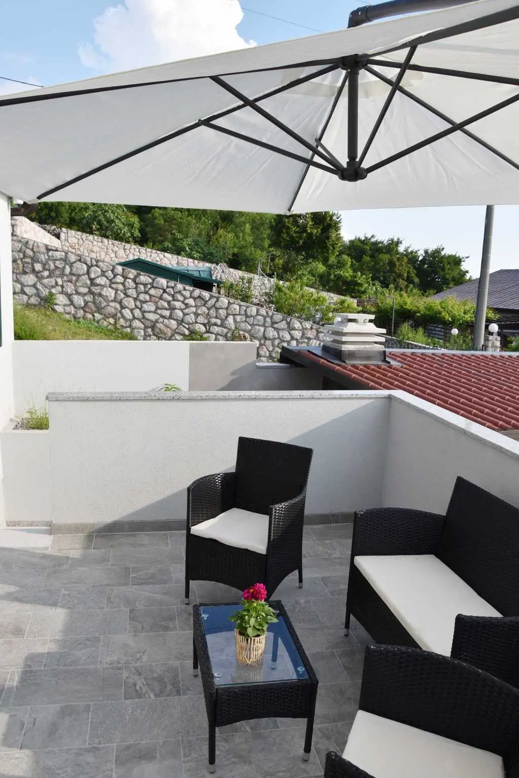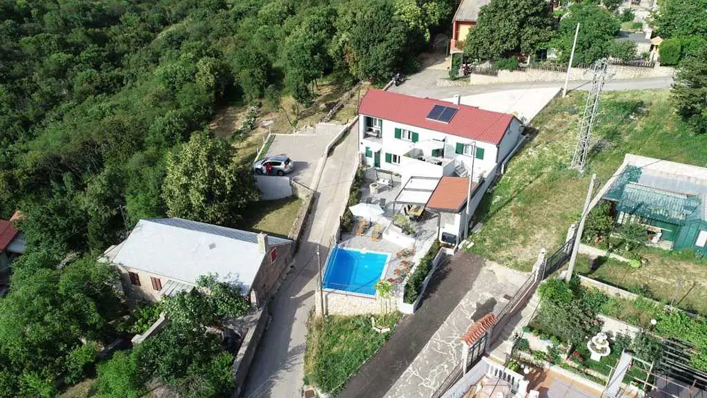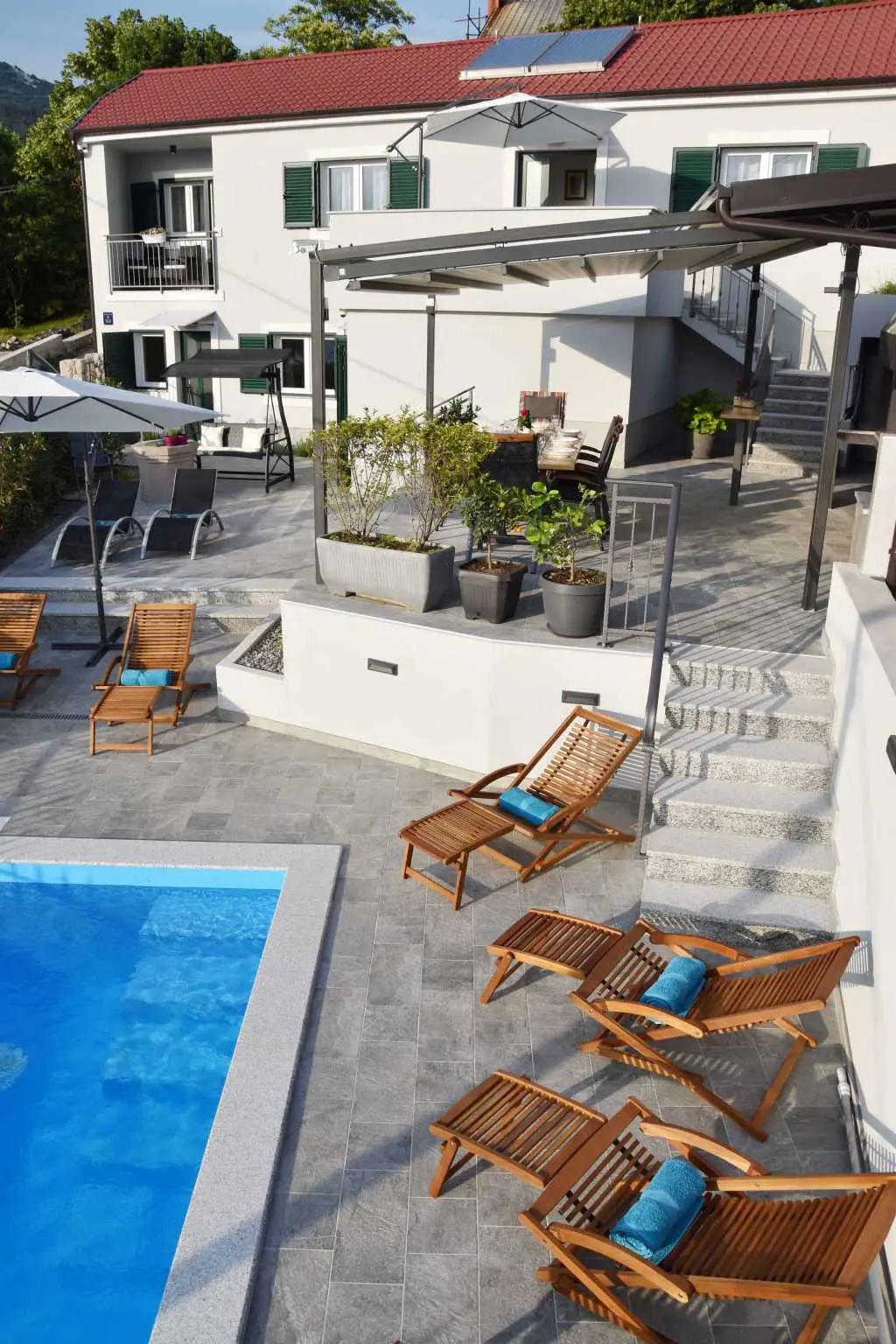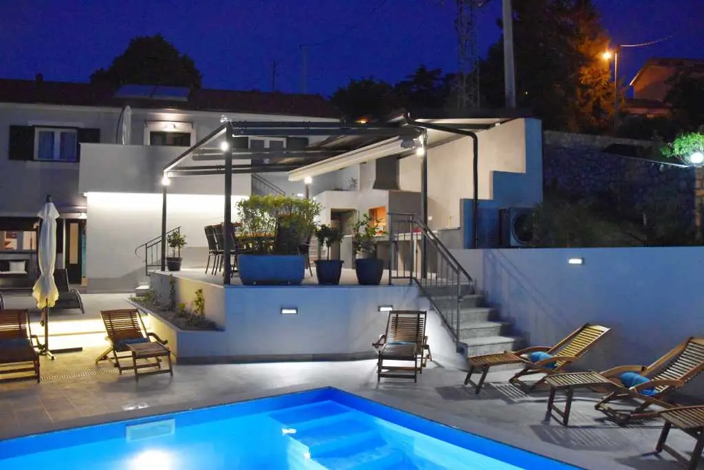 Vila z bazenom, teraso, žarom, otroškim igriščem, savno in telovadnico, Hrvaška Novo prenovljena hiša Leticija s 5 zvezdicami se nahaja v Kvarnerskem zalivu v slikoviti vasici Hreljin. Majhna, tradicionalna vasica med morjem in gorami ponuja mir in sprostitev. Raj za sproščujoče počitnice. V vasi so trgovina z živili, mesnica, kavarna v lekarni in bankomat. 10 minut vožnje z avtom do plaž na Adraitskem morju in 15 minut do gora Gorskega kotarja. Čudoviti gozdovi okoli in tri jezera so idealni za sprehode ali kolesarjenje. Popolna počitniška hiša za lepe večere žara s prijatelji ali družino na terasi ob bazenu s pogledom na morje. Hiša je sestavljena iz 2 nadstropij. V pritličju je dnevna soba, kuhinja z jedilnico, kopalnica, stranišče, savna, fitnes, pralnica. 1. nadstropje dostopno po zunanjih in notranjih spiralnih stopnicah: 2 dvoposteljni spalnici, vsaka s svojo kopalnico in 1 družinska soba (2 ločeni spalnici) s kopalnico, balkonom in teraso s pogledom na morje. Na voljo so parkirišče, garaža in otroško igrišče. Opremljenost: • Ogrevan bazen • Savna • Klima • Sat TV • Prostor za žar • Internet • Parkirišče • Garaža • Pomivalni stroj • Mikrovalovna pečica • Pralni stroj • Fitness soba