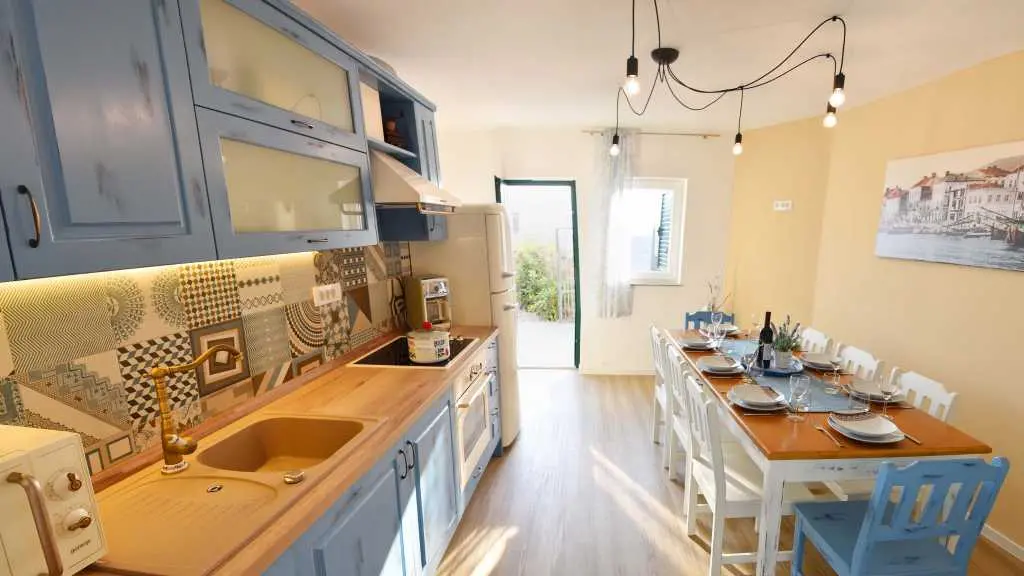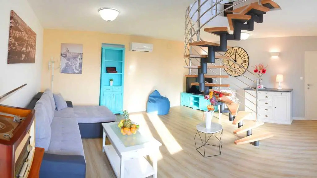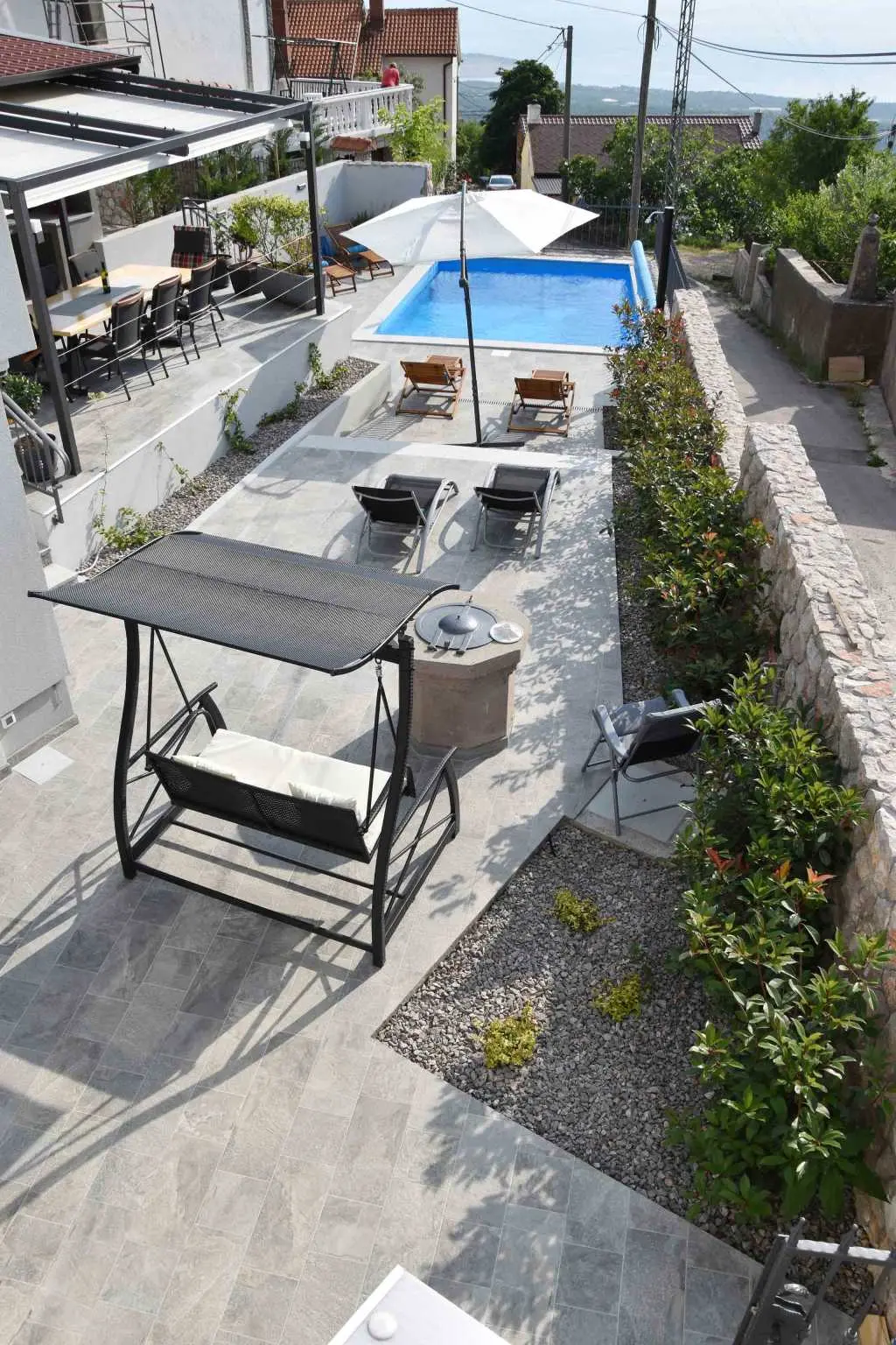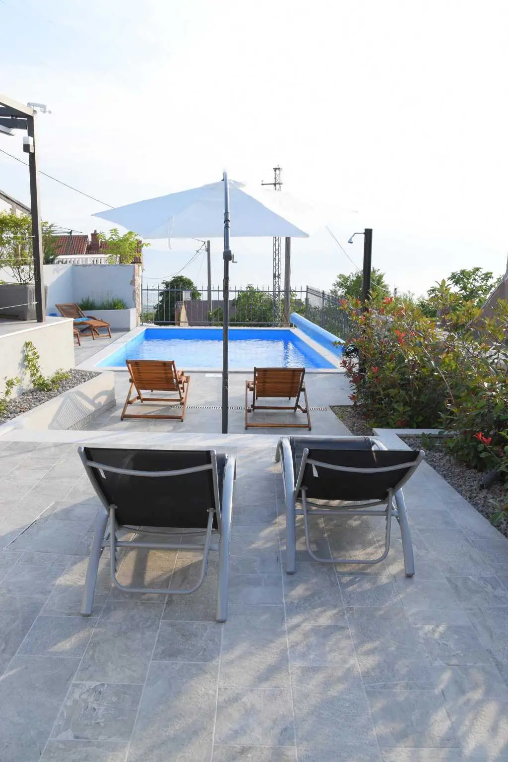 Vila z bazenom, teraso, žarom, otroškim igriščem, savno in telovadnico, Hrvaška Novo prenovljena hiša Leticija s 5 zvezdicami se nahaja v Kvarnerskem zalivu v slikoviti vasici Hreljin. Majhna, tradicionalna vasica med morjem in gorami ponuja mir in sprostitev. Raj za sproščujoče počitnice. V vasi so trgovina z živili, mesnica, kavarna v lekarni in bankomat. 10 minut vožnje z avtom do plaž na Adraitskem morju in 15 minut do gora Gorskega kotarja. Čudoviti gozdovi okoli in tri jezera so idealni za sprehode ali kolesarjenje. Popolna počitniška hiša za lepe večere žara s prijatelji ali družino na terasi ob bazenu s pogledom na morje. Hiša je sestavljena iz 2 nadstropij. V pritličju je dnevna soba, kuhinja z jedilnico, kopalnica, stranišče, savna, fitnes, pralnica. 1. nadstropje dostopno po zunanjih in notranjih spiralnih stopnicah: 2 dvoposteljni spalnici, vsaka s svojo kopalnico in 1 družinska soba (2 ločeni spalnici) s kopalnico, balkonom in teraso s pogledom na morje. Na voljo so parkirišče, garaža in otroško igrišče. Opremljenost: • Ogrevan bazen • Savna • Klima • Sat TV • Prostor za žar • Internet • Parkirišče • Garaža • Pomivalni stroj • Mikrovalovna pečica • Pralni stroj • Fitness soba
