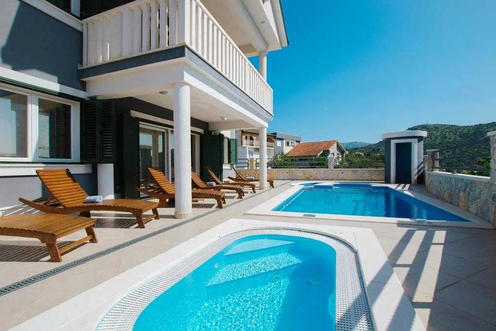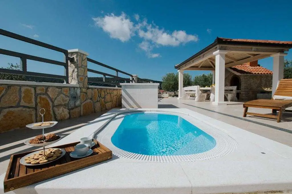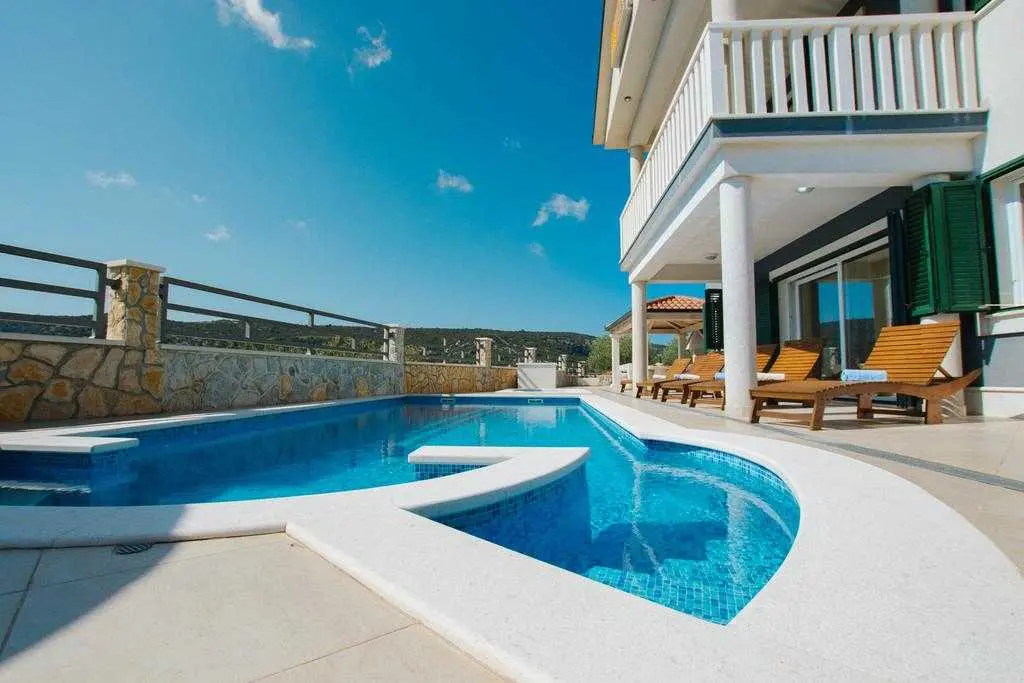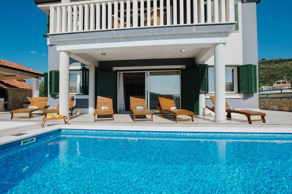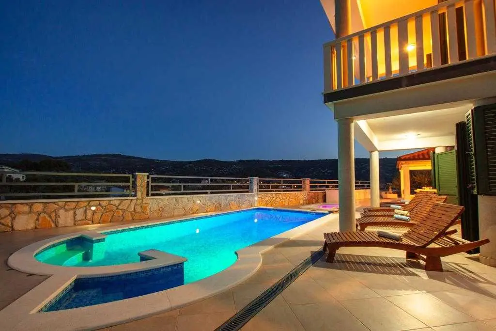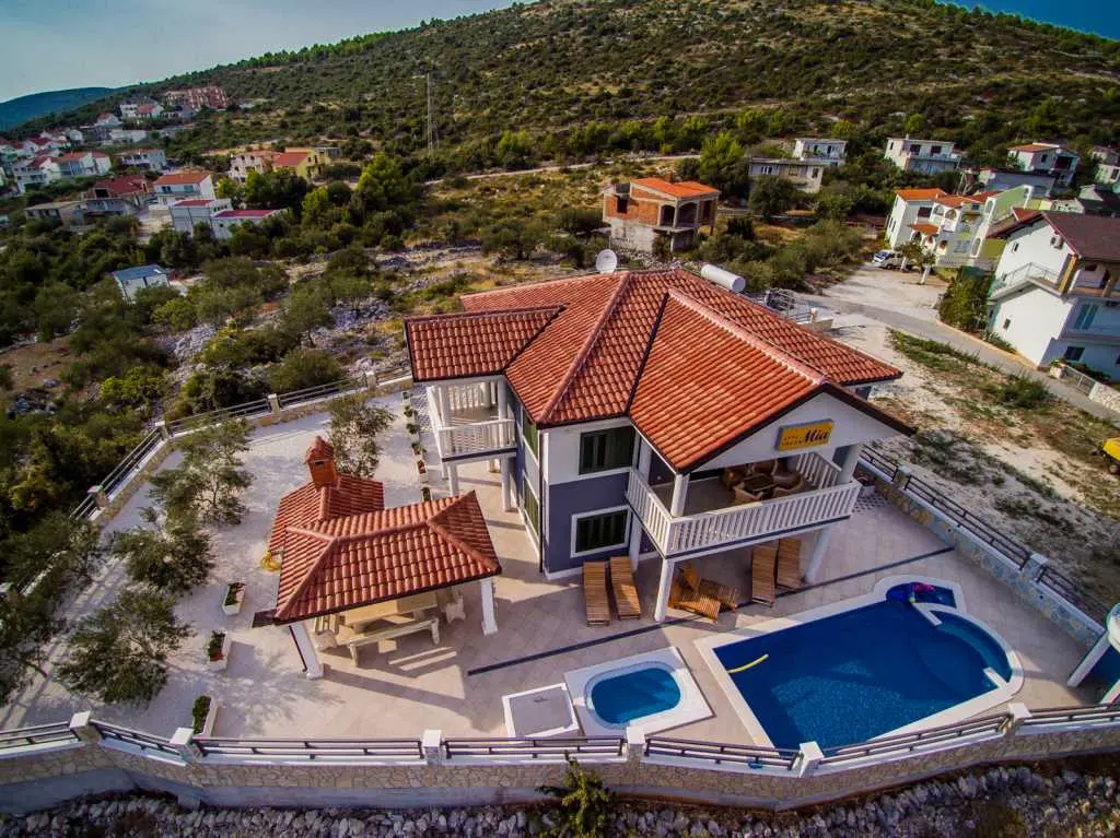 Ta lepa in zelo udobna hiša z bazenom se nahaja na hribu v dalmatinskem mestecu Marina. Sodobno opremljeno in udobno. Sestoji iz pritličja, kjer je kopalnica, kuhinja in dnevna soba z izhodom na bazen. V prvem nadstropju so štiri spalnice, kopalnica, pralni stroj in dva balkona. Na prostoren vrt z velikim kaminom, si lahko pripravite jedi in žar in uživajte v zelenju in razgled na zaliv. V marini so čudovite peščene plaže in Trogir, mesto pod zaščito Unesca, je le 13 km stran.