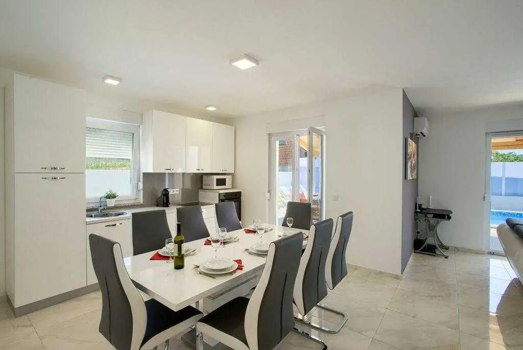 Lepa in moderno opremljena Villa Sanja z bazenom v majhni vasici Plovanija, ki leži na severu Istre in je obdana z najlepšimi mesti Istre, kot so Buje, Umag, Poreč, Rovinj in številna druga. Vila Sanja je od mesta Umag oddaljena 8 km in od plaže Kanegra le 5 km. Letališče Pula je oddaljeno 65 km. Hiša je primerna za 8 oseb. V notranjosti hiše je prijetna dnevna soba z LCD in odprto popolnoma opremljeno kuhinjo in jedilnico. Vsaka od 4 spalnic ima svojo kopalnico, LCD in klimatsko napravo ter zasebno teraso s čudovitim pogledom na vrt in bazen. Jedilnica ima dostop do bazena in jedilnice na prostem. Žar na žaru na vrtu je kot nalašč za pripravo okusnih poletnih jedi. Na soncu se lahko sprostite ob velikem zasebnem bazenu in si na žar pripravite okusne specialitete. Če želite jesti zunaj, sta 2 pokriti terasi. Za naše goste imamo na voljo WiFi in zasebno parkirišče. Dobrodošli v vili Sanja, Plovanija in Istri in želimo vam prijeten oddih!
